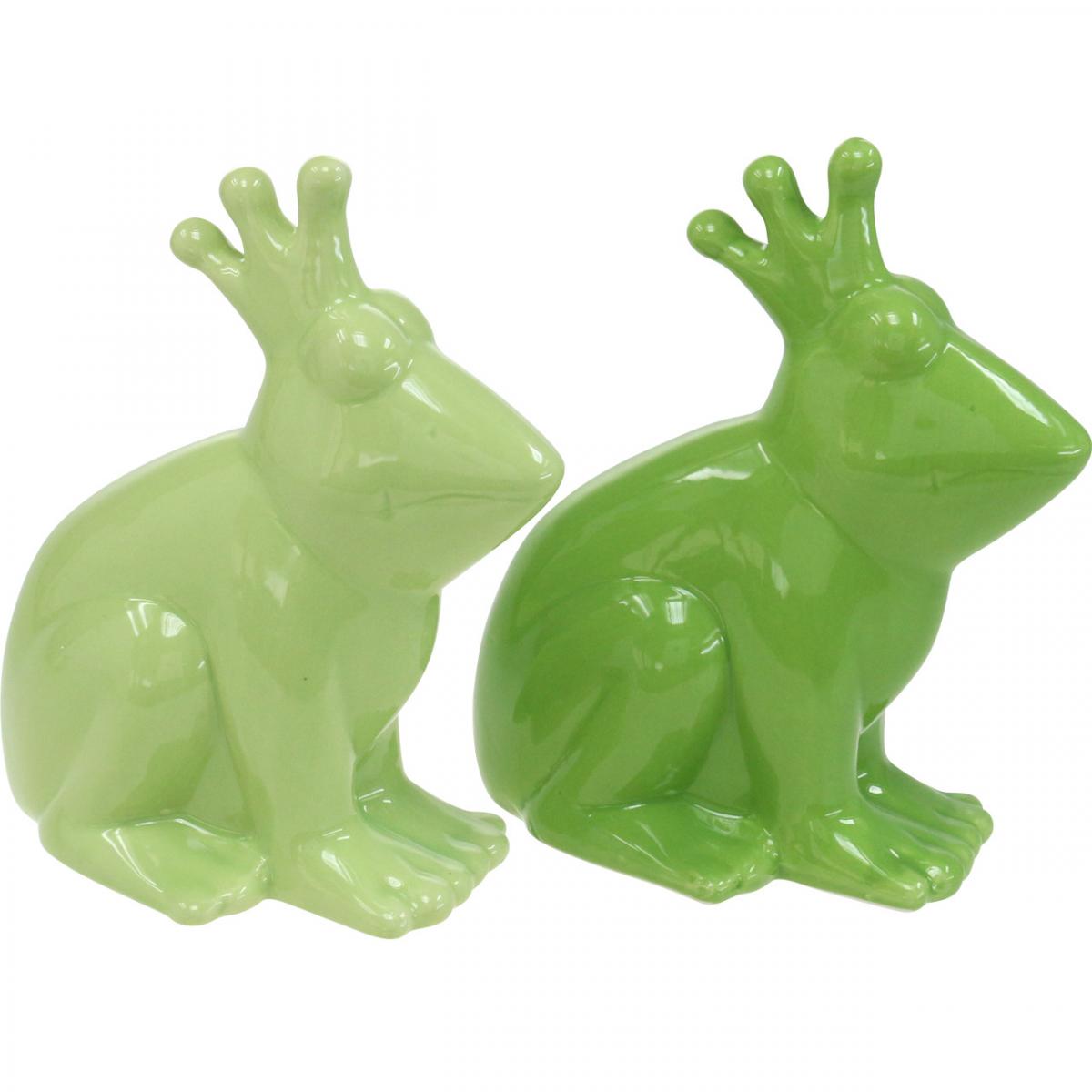 Cette grenouille décorative en céramique aime prendre une belle place dans votre intérieur. Deux princes grenouilles forment la décoration estivale idéale pour la maison et le jardin.Les deux figures de grenouilles sont recouvertes d'une glaçure brillante. Un prince grenouille est de couleur vert clair et l'autre est de couleur vert foncé. Les détails de la figure décorative, tels que la couronne, la tête et les jambes, ne sont pas trop fantaisistes, mais inspirent par leur élégante simplicité.