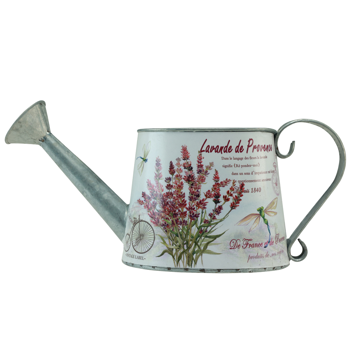 L'arrosoir décoratif évoque la lavande de Provence. Avec des libellules et un paysage sur fond blanc, le pichet décoratif apporte des couleurs vives !Le récipient en métal fonctionnerait comme un véritable arrosoir car l'intérieur est galvanisé en argent. Le pot décoratif rouillerait alors probablement très rapidement. Mieux vaut donc le décorer avec des fleurs artificielles, des fleurs séchées ou un petit pot de fleur que vous aurez préalablement enveloppé dans du papier aluminium. Vous pouvez également placer un mini vase en verre dans le pichet pour présenter un bouquet de fleurs rustique et rétro sur la table.