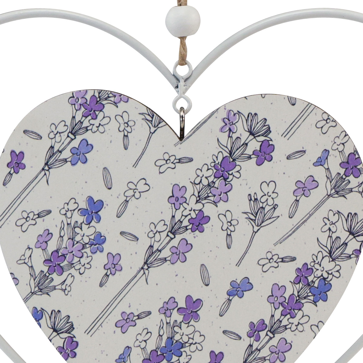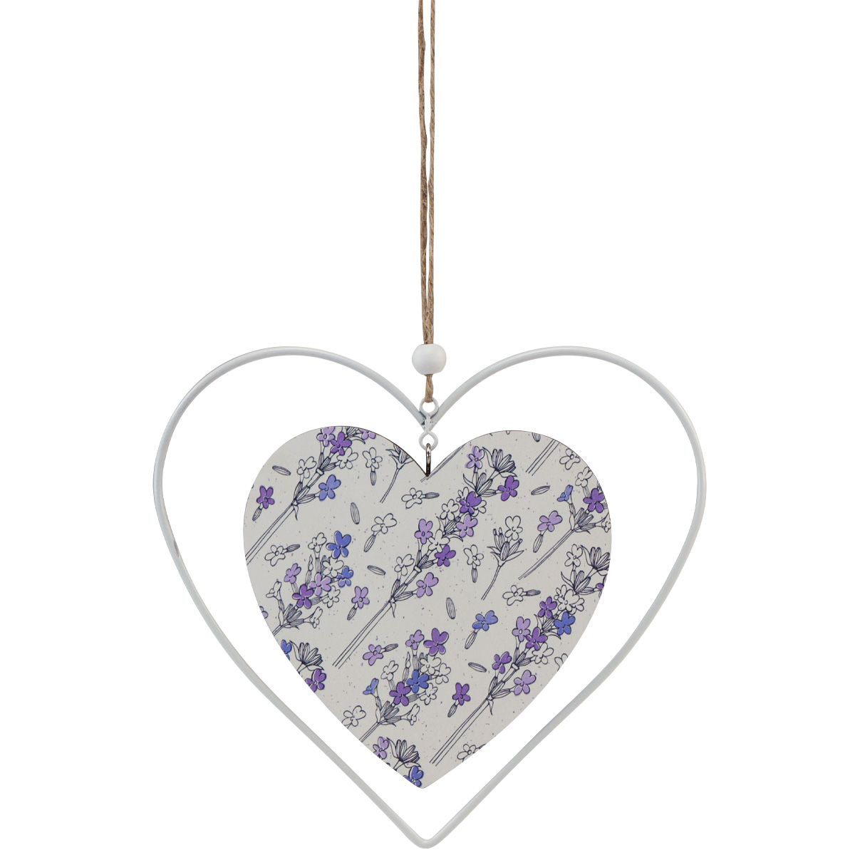 Im weißen Metallrahmen der Herzen hängt ein kleineres Holzherz. Die weißen Deko-Herzen zum Aufhängen ziert ein modernes Muster aus Blüten und Blumensträußen in verschiedenen Lila-Tönen. Die Rückseite ist aus unbehandeltem, hellem Holz. Wenn Sie möchten, können Sie also mit den Holzherzen sogar Ihre ganz eigene Deko gestalten, indem Sie die Oberfläche bemalen, bekleben oder sogar einen Schriftzug einbrennen.