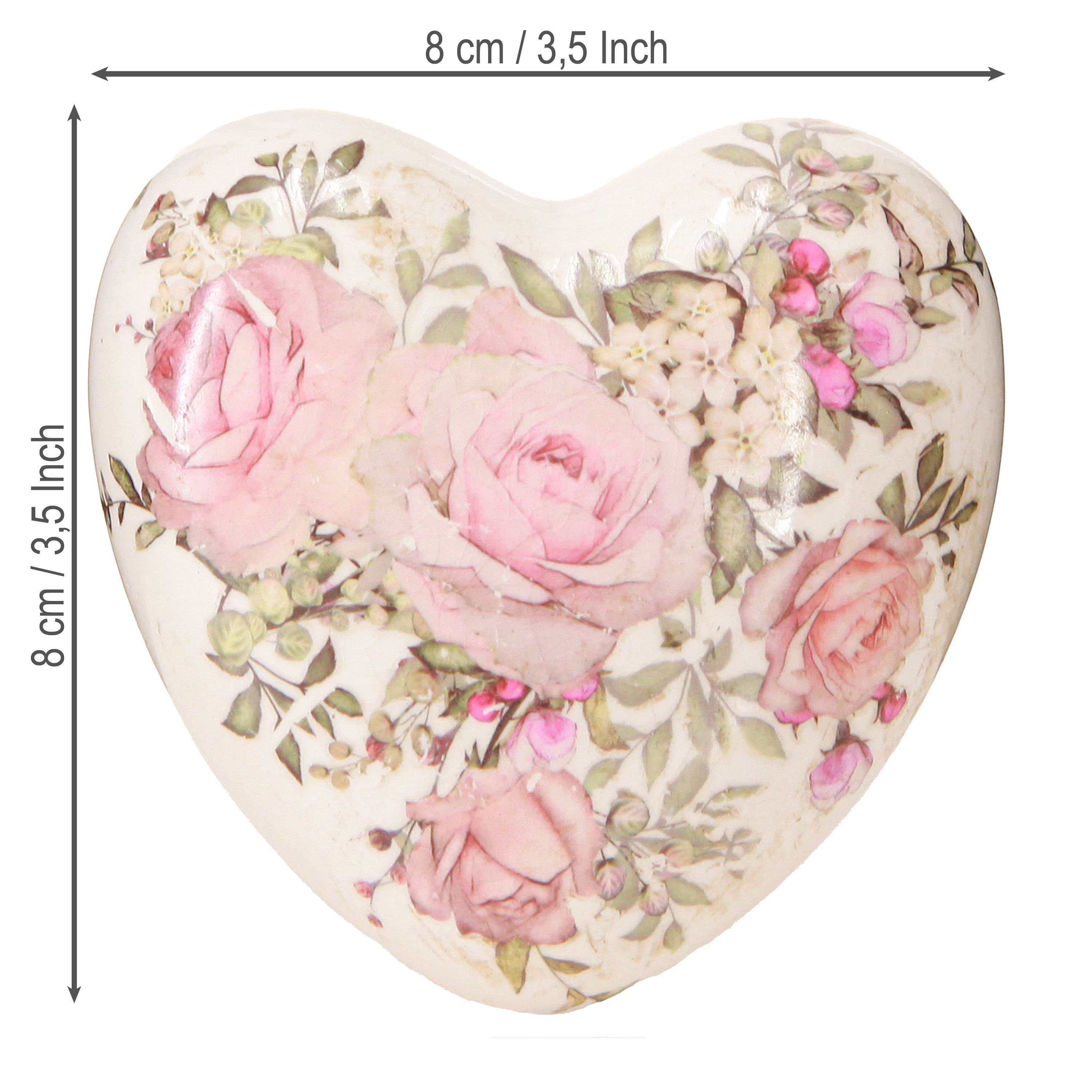 Lasciatevi conquistare dall'incantevole bellezza dei nostri tre cuori decorativi, caratterizzati da un romantico motivo a rosa nei toni del crema e del rosa tenue. I cuori decorativi in ceramica sono particolarmente affascinanti grazie al loro effetto craquelé e si adattano perfettamente allo stile vintage o country. Ogni cuore misura circa 8x8 cm ed è rivestito con una vernice trasparente lucida che mette in risalto i delicati dettagli della rosa. Il fondo è dotato di tre protezioni per preservare i mobili dai graffi. Questi cuori decorativi non sono solo un'aggiunta magica alla vostra casa, ma anche un regalo meraviglioso per gli innamorati o per un matrimonio. Disponi i cuori in ceramica sulla tua tavola come decorazione primaverile oppure usali come elemento decorativo nel tuo soggiorno. Che sia in primavera o in estate, questa decorazione a forma di cuore smaltato aggiunge sempre un tocco romantico alla vostra casa.