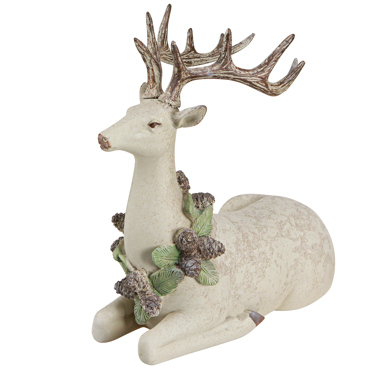 Diese liegende Hirschfigur mit ihrem ruhigen stolzen Blick verzaubert durch die liebevoll gestalteten Details und die hochwertige Verarbeitung. Die rustikale Hirschfigur im Landhausstil fügt sich harmonisch in jede Einrichtung ein und lässt sich wunderbar mit weiteren Wohnaccessoires kombinieren. Das blassgrüne Design macht den Hirsch zu einer gemütlichen Wohnzimmerdeko und einem einladenden Akzent für den Eingangsbereich. Der Kranz aus Blättern und Zapfen um den Hals des Hirsches verleiht Ihm eine festliche Erscheinung und macht ihn zur perfekten Tischdeko für Weihnachten.