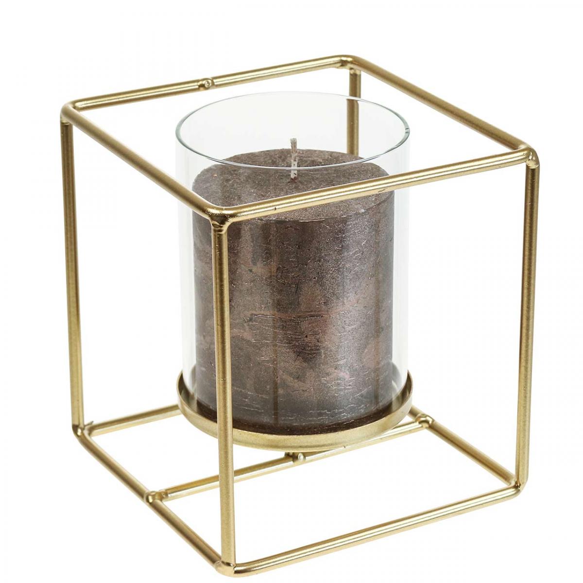 Sorprendente ed elegante, questo portacandele decorativo nei colori oro è sinonimo di illuminazione in uno stile particolarmente elegante. L'imponente lanterna forma un cubo fatto di aste metalliche.All'interno dell'esclusivo cubo di metallo si trova un supporto con un vetro a lanterna per i tradizionali lumini. Da ogni lato si può vedere chiaramente la candela illuminata nel vetro cilindrico della lanterna.