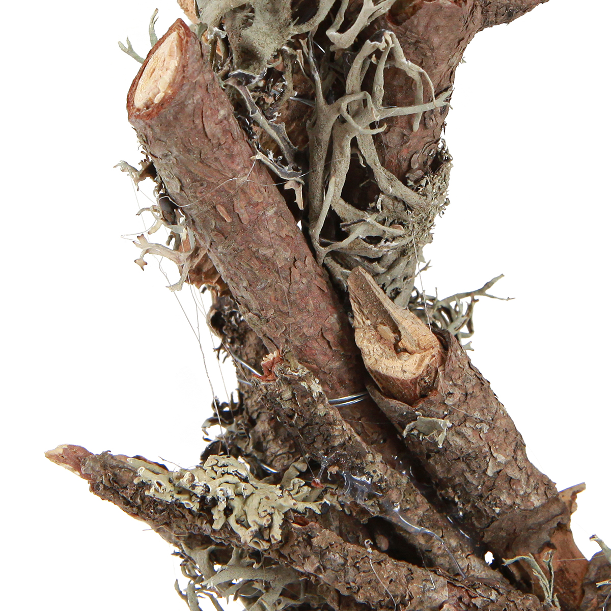 La corona decorata con rami e corteccia ha un diametro esterno di circa 40 centimetri e un diametro interno di circa 20 centimetri, essendo alto circa 7 centimetri.