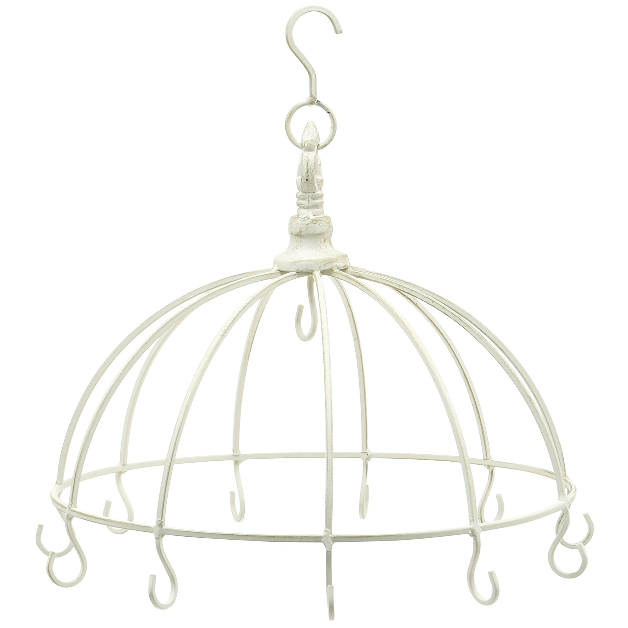 Die hübsche Deko-Krone aus Metall in Weiß besitzt an der Oberseite eine floral verzierte Spitze und einen großen Haken zum Aufhängen. Insgesamt elf Haken am unteren Ring laden zum vielfältigen Dekorieren ein. Der Deko-Ring besitzt einen Durchmesser von circa 29 Zentimetern. Mit Haken beträgt der Durchmesser der Deko-Krone ungefähr 34 Zentimeter. Die Höhe des Korbs liegt bei etwa 17 Zentimeter. Mit Aufhängung ist die Metallkrone ungefähr 32 Zentimeter hoch.