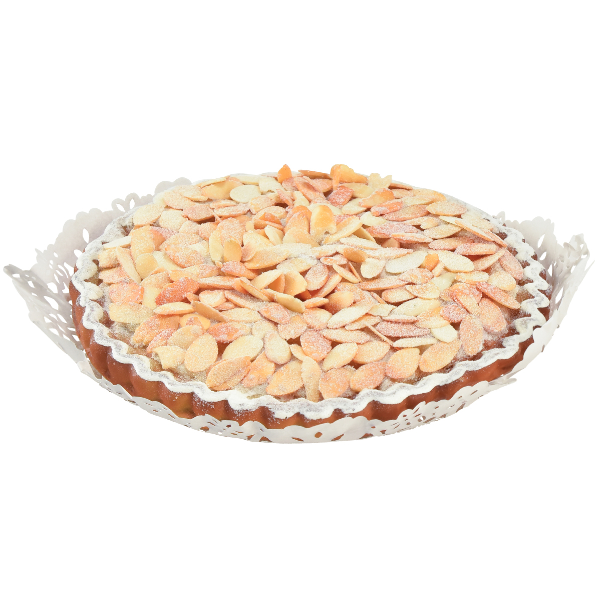 Mit feinem Zucker bestäubt, bedecken die gerösteten Mandelplättchen den goldbraunen Tortenboden. Die Mandeltarte ist von einem Zuckerrand umgeben und ruht auf Tortenspitze wie beim Konditor. Diese Lebensmittelattrappe macht die Illusion also in jeder Hinsicht perfekt.