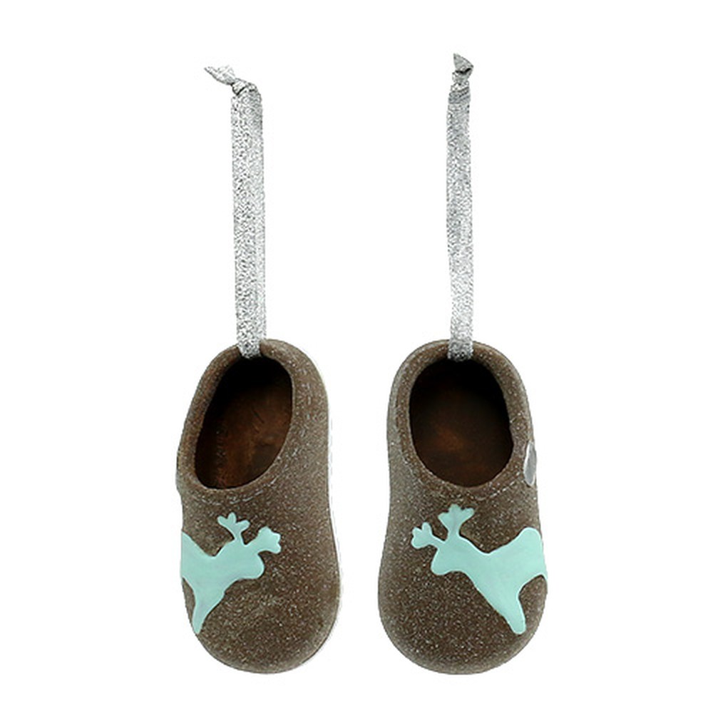 Suchen Sie noch nach einem ausgefallenen Detail für Ihre Weihnachtsdekoration? Wie wäre es mit diesem Deko-Pantoffel in Braun als Anhänger? Dekorieren Sie doch die Wand hinter Ihrem Schuhschrank oder Schuhregal mit den lustigen Mini-Pantoffeln: Hängen Sie die Deko-Schuhe an die Wand und stecken Sie vielleicht noch einen kleinen Tannenzweig in die Öffnung – fertig ist ein attraktiver Wandschmuck für den Winter!Die dekorativen Mini-Pantoffeln sind aus Gips gefertigt. Den Spann ziert die Silhouette eines Rentiers in Eisblau. Achten Sie besonders auf die vielen niedlichen Details: die stilisierte silberne Schnalle auf der Außenseite, das angedeutete Profil der Sohle und die Naht entlang der Öffnung des Deko-Schuhs. Die braune Oberfläche ist mit einer Art Dekosand aufgeraut worden. Durch die Ferse ist ein silbernes Organzaband gezogen, sodass Sie den Schuh leicht aufhängen können.