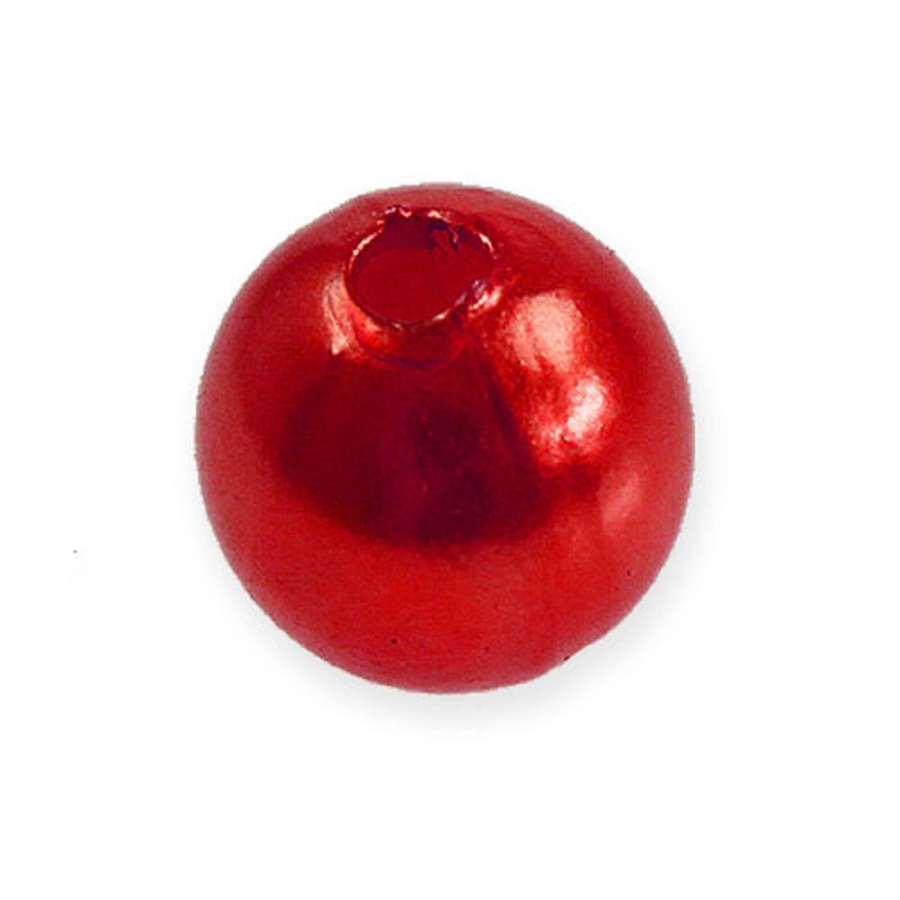 Jede Deko-Perle in Rot misst im Durchmesser rund 10 Millimeter. Der Durchmesser der Löcher beträgt etwa 3 Millimeter.