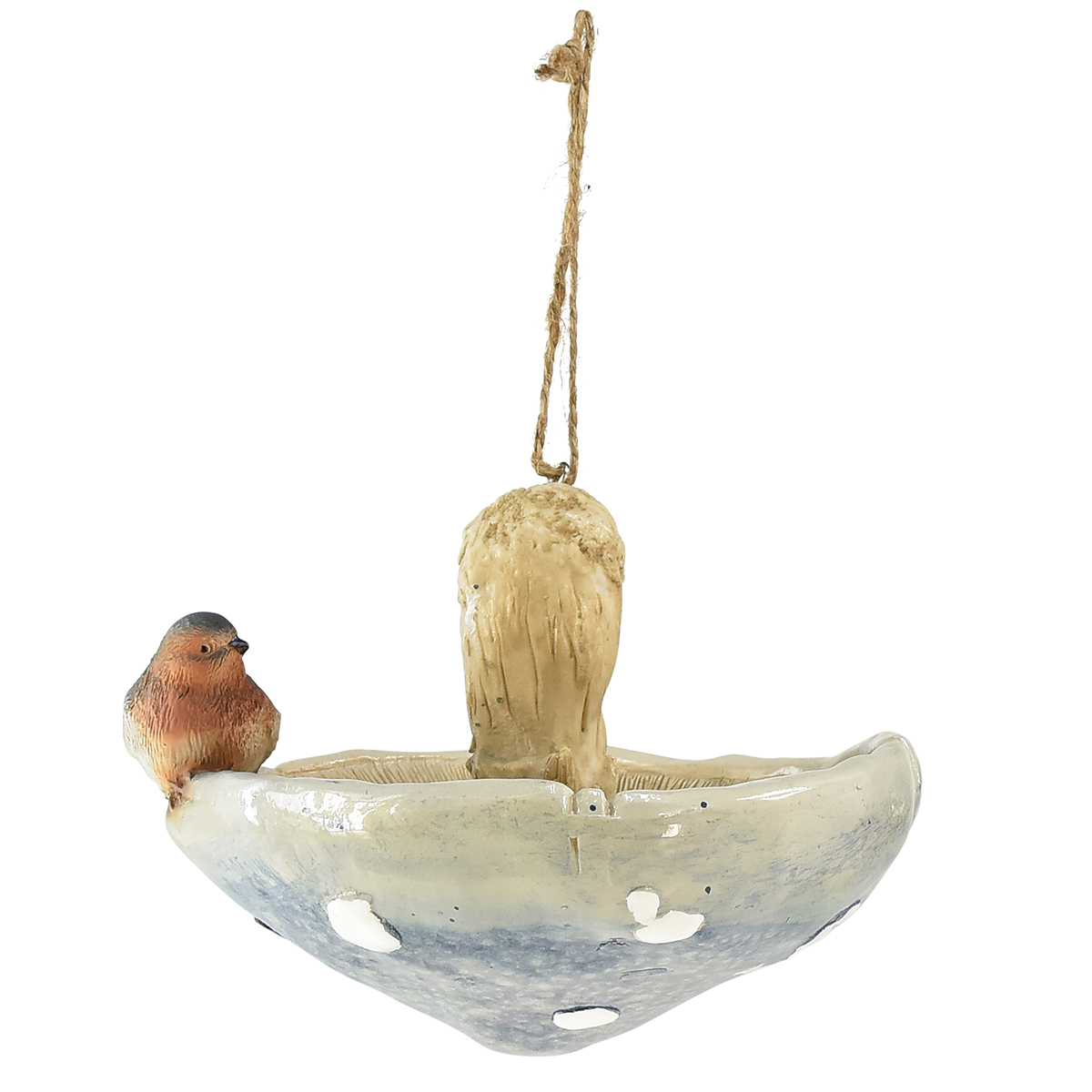 Die Unterseite des Pilzes, also die Pilzkappe, ist wie Keramikdeko blauweiß als Fliegenpilz glasiert. Die Lamellen und der Stiel stellen hingegen eine detailgetreue Nachbildung eines echten Waldpilzes dar. Das kleine Rotkehlchen auf dem Rand macht die Deko zum Hängen zum romantischen Hingucker.