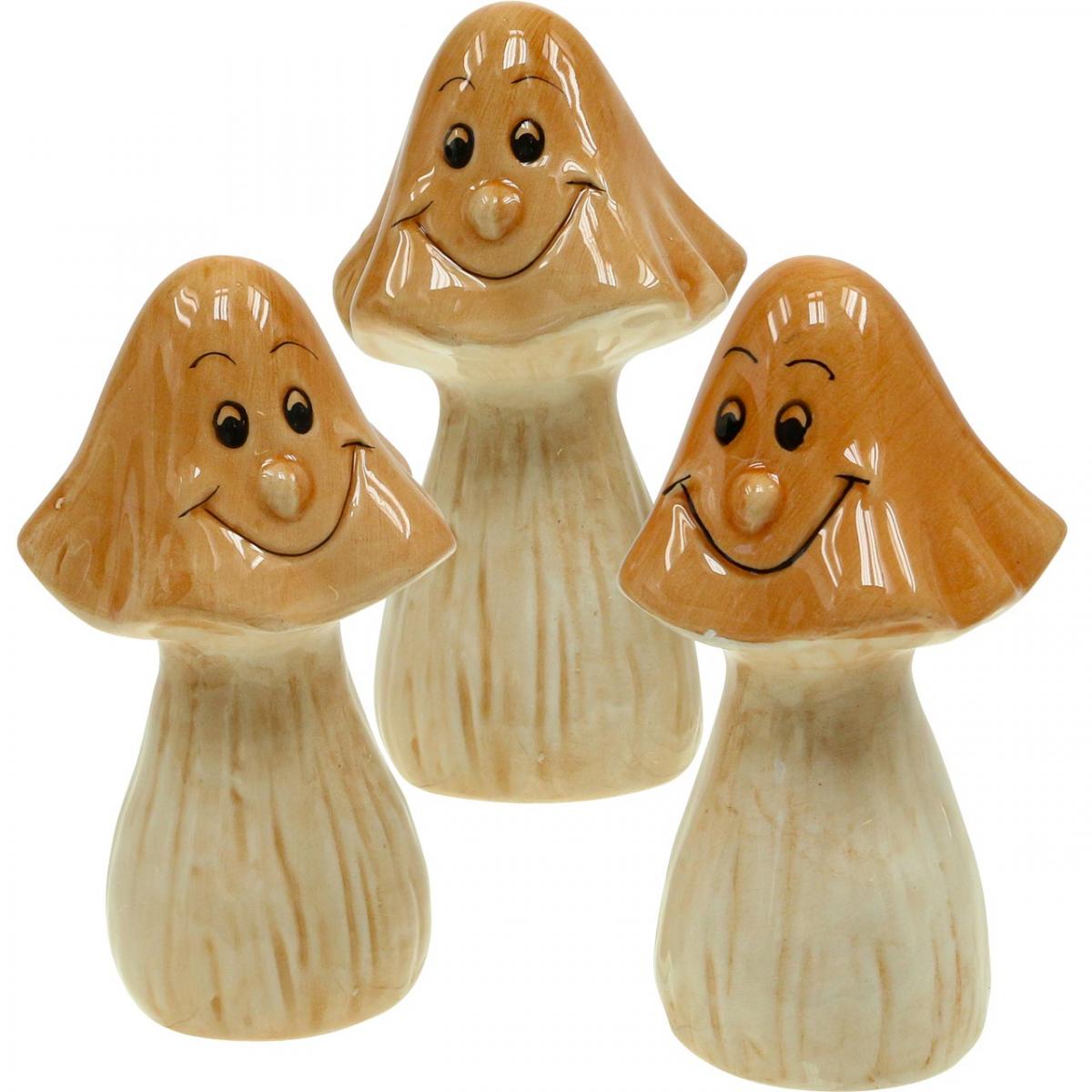 Questi funghi decorativi in ceramica mostrano il loro sorriso più bello per la decorazione autunnale! Le piccole figure diventeranno rapidamente i tuoi funghi preferiti grazie ai loro volti espressivi dipinti a mano e alla glassa multicolore.Il gambo dei funghi decorativi è molto chiaro, quasi color beige crema, il cappello è di un bel marrone chiaro. Le figure decorative hanno una base appiattita sotto e sono vuote all'interno.