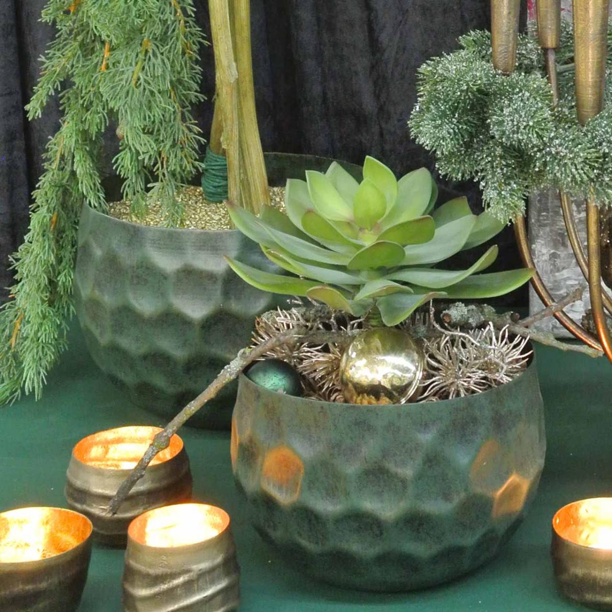 Les jardinières vertes sont également très populaires dans les décorations de Noël. Combinez vos plantes avec des lanternes et des décorations de Noël en or et noir, présentez les bols décoratifs avec des cônes et du vert sapin. Vous verrez à nouveau les bols décoratifs en métal vert foncé tout neufs !