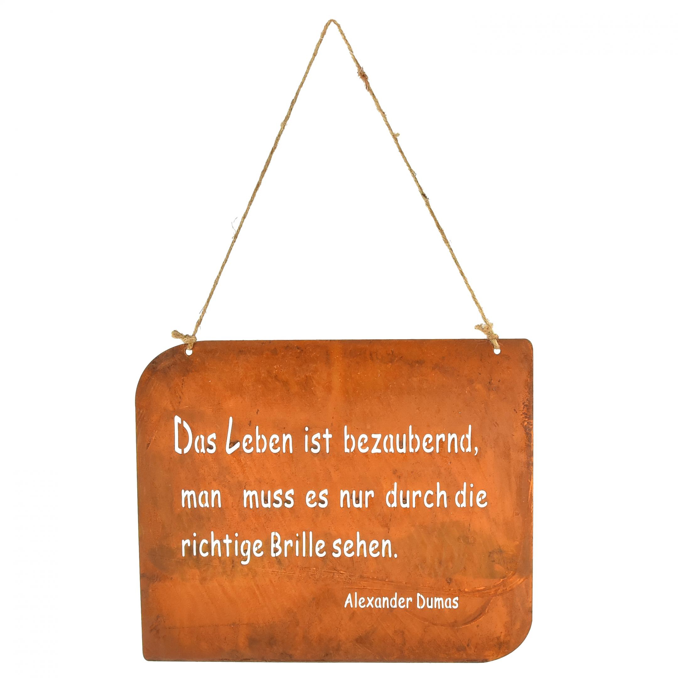 Potete fissare la targa da giardino in metallo come decorazione antiruggine con frase di Alexandre Dumas sul gazebo, all'ingresso del giardino o anche su un albero. L'effetto ruggine patinato in combinazione con la corda di iuta conferisce alla targa un fascino rustico.Sulla targa in metallo è fustellata una delle sagge parole dello scrittore francese: "La vita è incantevole, bisogna solo vederla con gli occhiali giusti". Quindi: restate ottimisti!