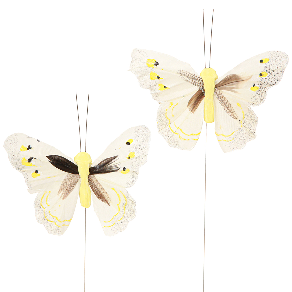 Les papillons ravissants sur fil se composent de plumes jaunes. Ils sont idéal pour agrémenter vos arrangements de printemps dans votre maison : sur la table, à la porte ou dans des chapelets déco. Vous pourrez les intégrer aussi dans des bouquets ou des compositions florales diverses.