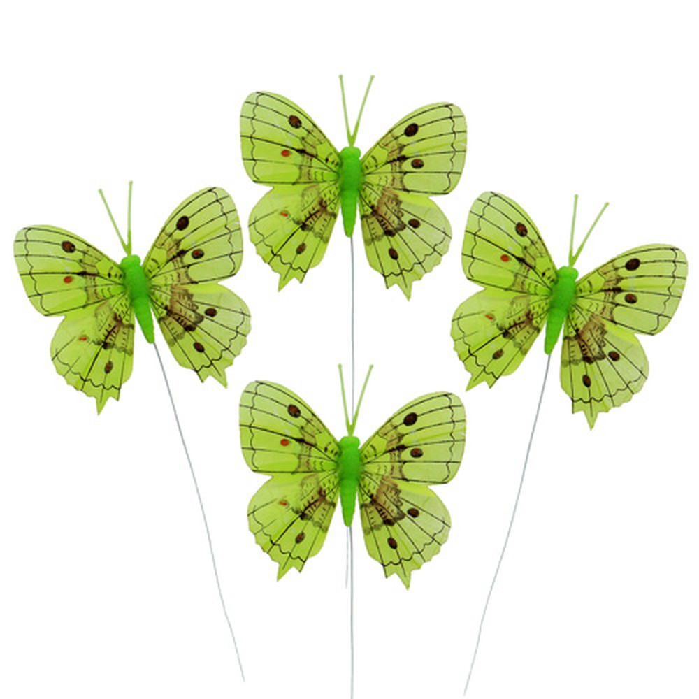 Les papillons sont lâchés ! Les petits compagnons peints en vert agrémenteront tous vos décorations de printemps. Grâce à la tige vous pourrez les insérez dans les pots de fleurs et d’herbes mais aussi dans les bouquets et les compositions florales. Ils embelliront aussi votre décoration de table et sont indispensable pour tous les fleuristes et les bricoleurs.Taille : env. 8cm, Longueur avec fil env. 20cm