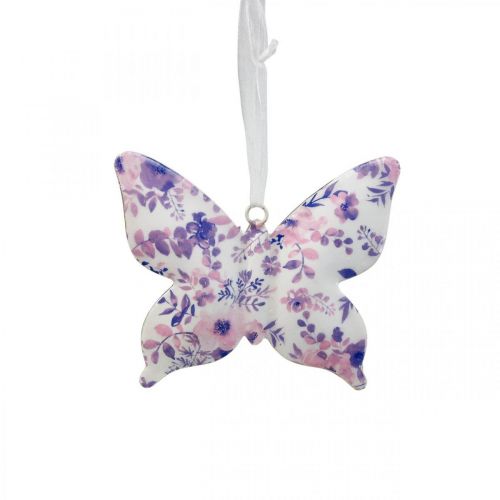 Zwei Blechstücke wurden ausgestanzt, kunstvoll gebogen und als Umrisse von Schmetterlingen übereinandergelegt. Die Dekoanhänger sind mit einer bedruckten Kunststofffolie überzogen, auf der ein lila Blumen- und Blättermuster zu sehen ist.