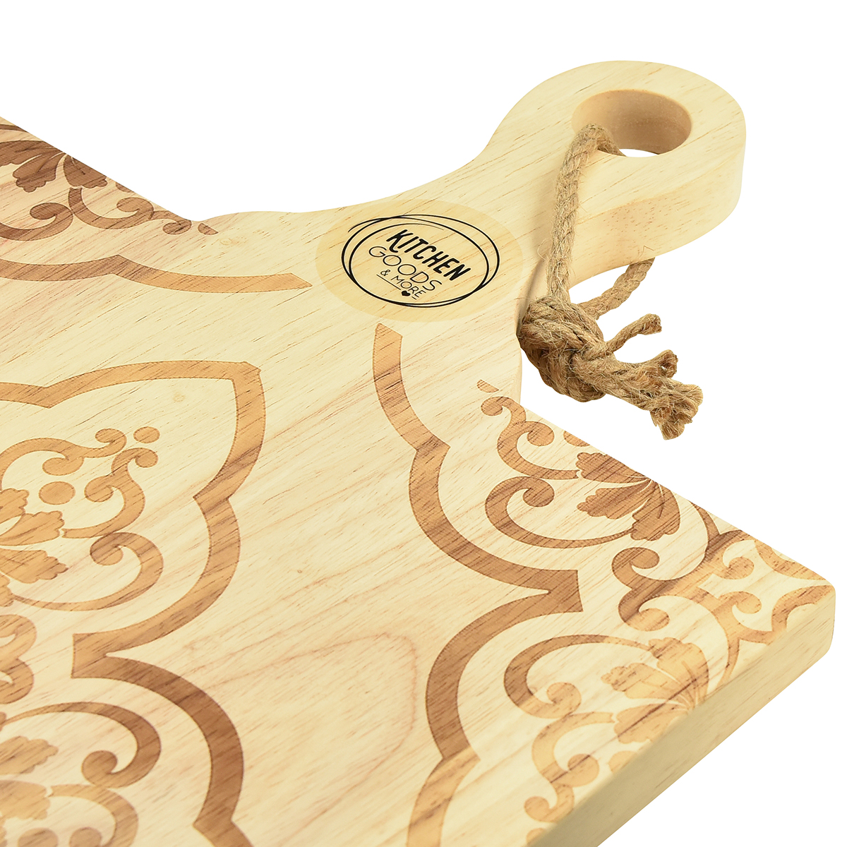 Das florale, ganz klassische Motiv ist dezent in das helle Holz eingebrannt und sieht ansprechend hellbraun aus. Am Griff lässt sich das Holzbrett als Wanddeko aufhängen. Das Schneidebrett ist für Dekorationen und auch kalte Lebensmittel geeignet, da das natürliche Mangoholz nicht nachbehandelt wurde.