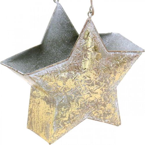 Der Deko-Stern aus Metall zum Aufhängen und Dekorieren ist ein golden glänzender Weihnachtsschmuck, den Sie sehr vielfältig verwenden können. Das verzinkte Gefäß ist mit geprägten Sternen verziert und hat einen praktischen Henkel. Künstliche Abnutzungsspuren und geweißte Ränder verleihen dem Weihnachtsstern seinen charaktervollen Antik-Look. Falls Sie den Stern zum Bepflanzen verwenden möchten, empfehlen wir das Auskleiden mit Pflanzfolie, um Feuchtigkeitsschäden zu verhindern.