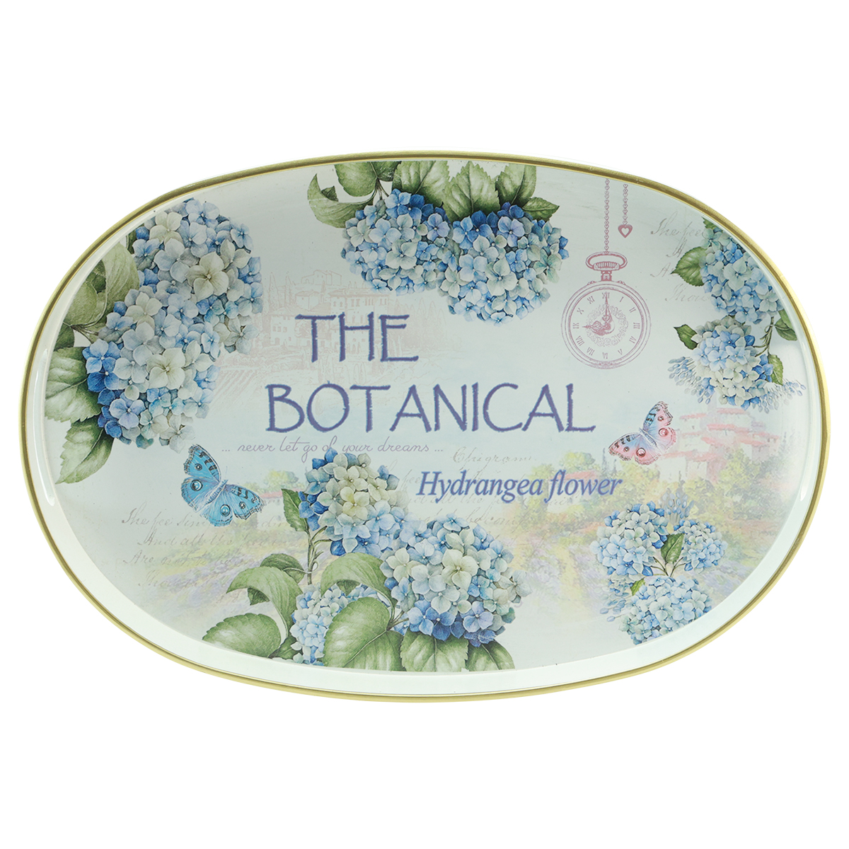 Die blauen Hortensien spielen die Hauptrolle, aber auch die Landschaften der Provence im Hintergrund und Schmetterlinge beleben das weiße Dekotablett. In den Rand sind zwei praktische Griffe eingelassen. Somit ist das Design des ovalen Tabletts in seiner Form modern und durch sein Motiv wunderschön Retro.