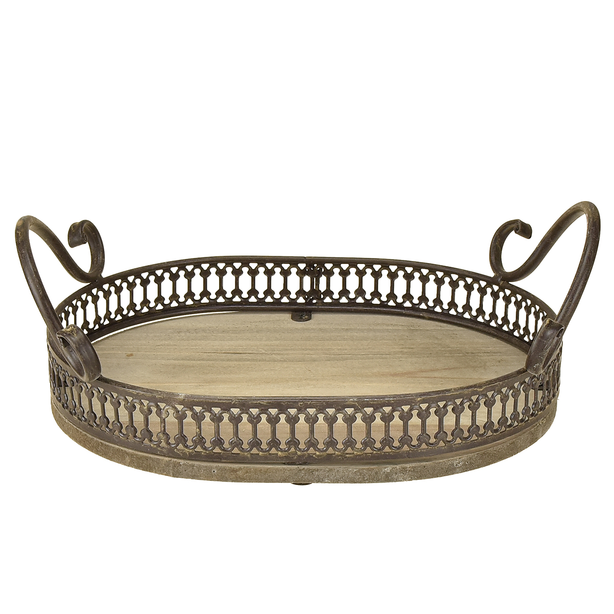 Mit einer Größe von etwa 23 x 17,5 x 7,5 Zentimetern ist das braune und ovale Deko Tablett beinahe perfekt für jeden Wohnraum geeignet, da das dekorative Holzbrett jede noch so kleine Fläche wunderbar aufwertet. Das stabile Brett besitzt an der Unterseite 4 Kunststoffscheiben, die als Rutschutz gelten. Das Metallgeländer ist kunstfertig mit schicken Blumenschnörkeln und 2 praktischen, geschwungenen Henkeln versehen, mit denen Sie das Deko Tablett sicher transportieren können.