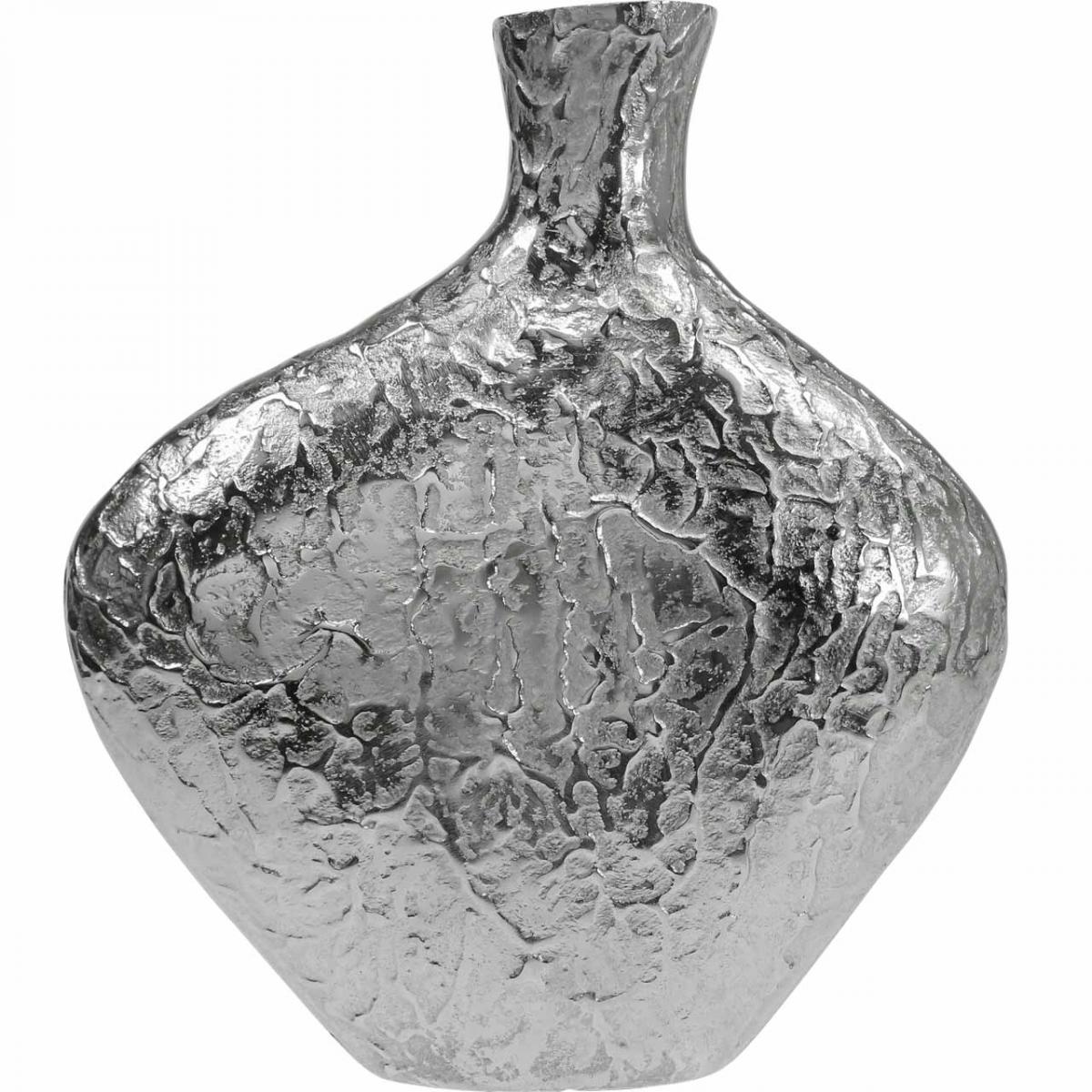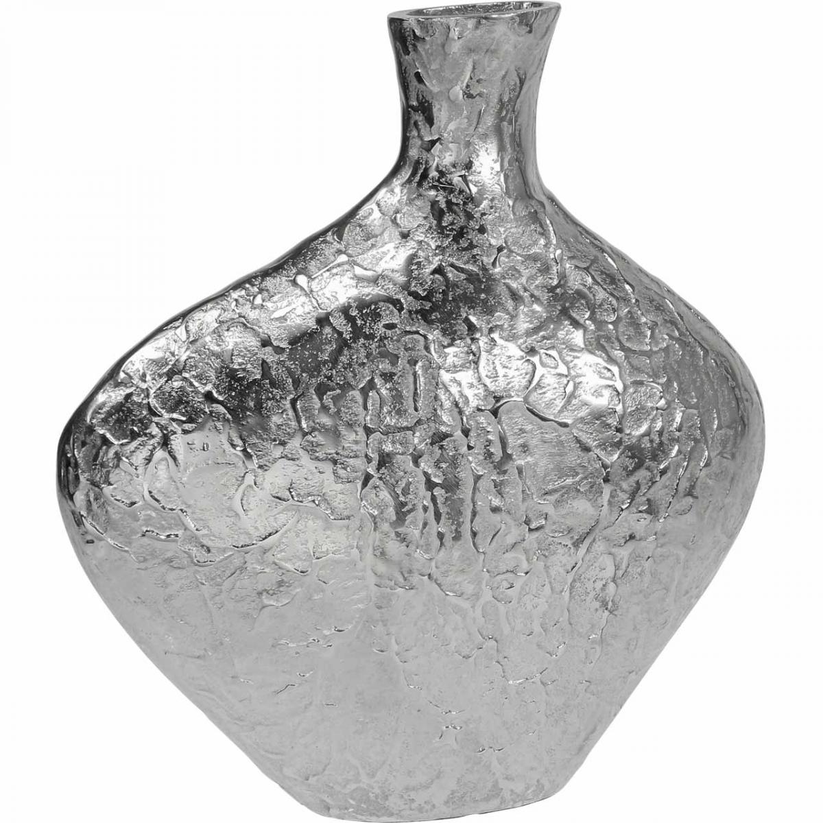 Mostra i tuoi fiori preferiti in questo vaso decorativo in metallo dal design accattivante. Il vaso per fiori in argento ha forme curve che ricordano un'elegante bottiglia.Il vaso dal design originale è allungato e compresso allo stesso tempo, con il collo che forma un'apertura. Il vaso in metallo è martellato e presenta sottili rientranze in filigrana e venature simili a rilievi.