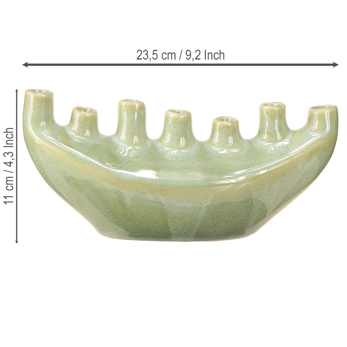 Die Schiffchen-Keramikvase in Hellgrün ist der perfekte Blickfang für Ihre moderne Wohnraumgestaltung. Mit ihrer einzigartigen Form, die an ein elegantes Boot erinnert, bringt sie eine frische Brise in jede Dekoration. Das sanfte, hellgrüne Keramikmaterial strahlt Harmonie aus und fügt sich nahtlos in verschiedene Einrichtungsstile ein, sei es moderner Minimalismus oder der beliebte Skandi-Stil. Diese dekorative Keramikvase verfügt über sieben Öffnungen für Blumen, ist aber eventuell leider nicht vollkommen wasserdicht, eignet sich jedoch ideal für Trockendeko und Kunstblumen. Dadurch eröffnet sich Ihnen eine Vielzahl kreativer Gestaltungsmöglichkeiten, um individuelle Akzente zu setzen. Ob im Wohnzimmer als Tischdeko oder als Arrangement für kleine Blumen in einem stilvoll gestalteten Bücherregal – sie überzeugt durch Vielseitigkeit und Stilbewusstsein. Lassen Sie Ihrer Kreativität freien Lauf und kombinieren Sie diese kreative Blumenvase mit weiteren stilvollen Accessoires von Floristik24, um ein harmonisches Gesamtbild zu schaffen.