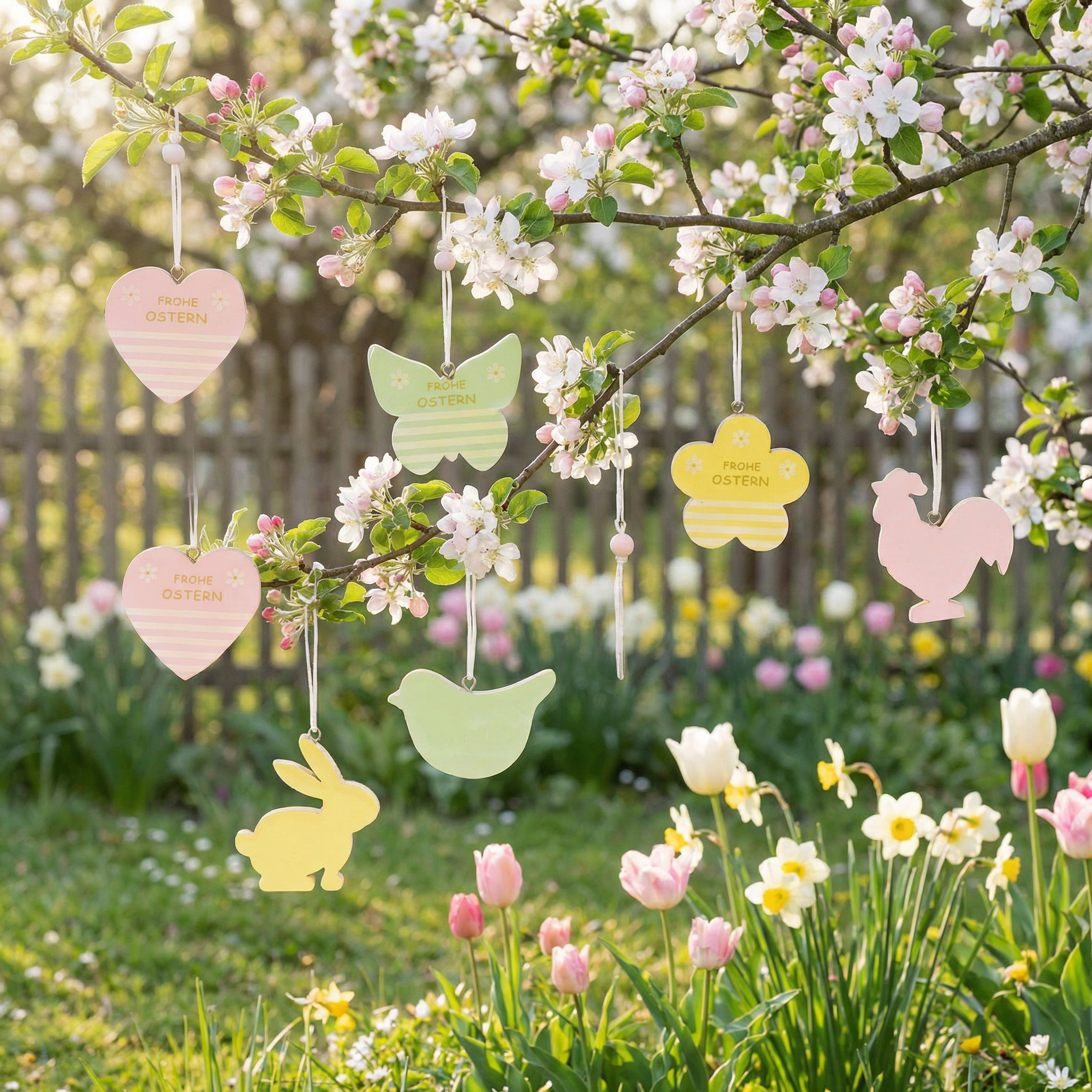 Sie erhalten sechs unterschiedliche Formen in insgesamt drei Pastellfarben: einen gelben Hasen, einen rosa Hahn und einen grünen Vogel. Dazu kommen der Schmetterling in Grün mit weißen Streifen und der goldenen Aufschrift: „Frohe Ostern“. Auch die gelbe Blüte und das rosa Herz wünschen Ihnen und Ihren Lieben „Frohe Ostern“.