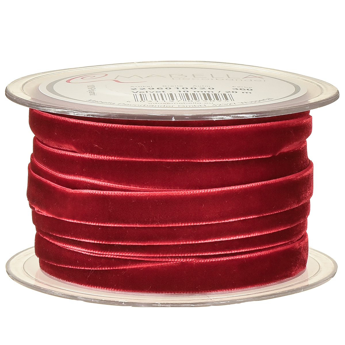Le ruban déco rouge bordeaux est fait de velours doux et est attaché à une bobine en plastique avec une petite aiguille. La longueur totale de la bande est d'environ 20 mètres et la largeur d'environ 10 millimètres.