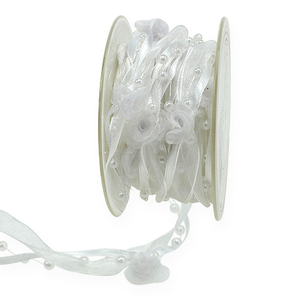 Le ruban de décoration blanc "Valentino" composé à 100% de polyester est fourni sur une bobine en plastique et mesure environ 15 millimètres de large sur 5 mètres de long. Alors que les roses mesurent environ 2 centimètres de diamètre, les perles ne font qu'environ 4 millimètres.