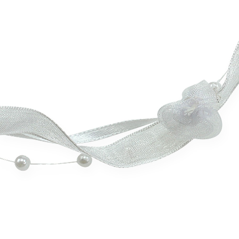 Das weiße Dekoband „Valentino“ aus 100% Polyester wird auf einer Kunststoff-Spule geliefert und ist etwa 15 Millimeter breit und ungefähr 5 Meter lang. Während die Rosen im Durchmesser circa 2 Zentimeter messen, sind es bei den Perlen nur etwa 4 Millimeter.