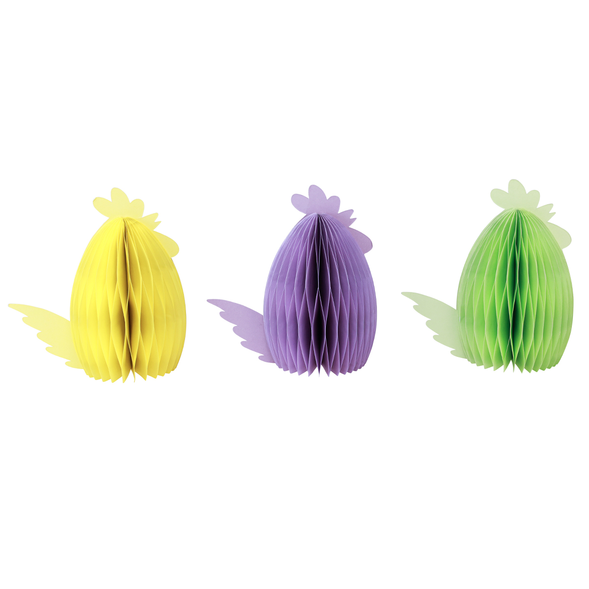 Poules en nid d'abeille – charmantes décorations de poulet de Pâques en jaune, vert et violet