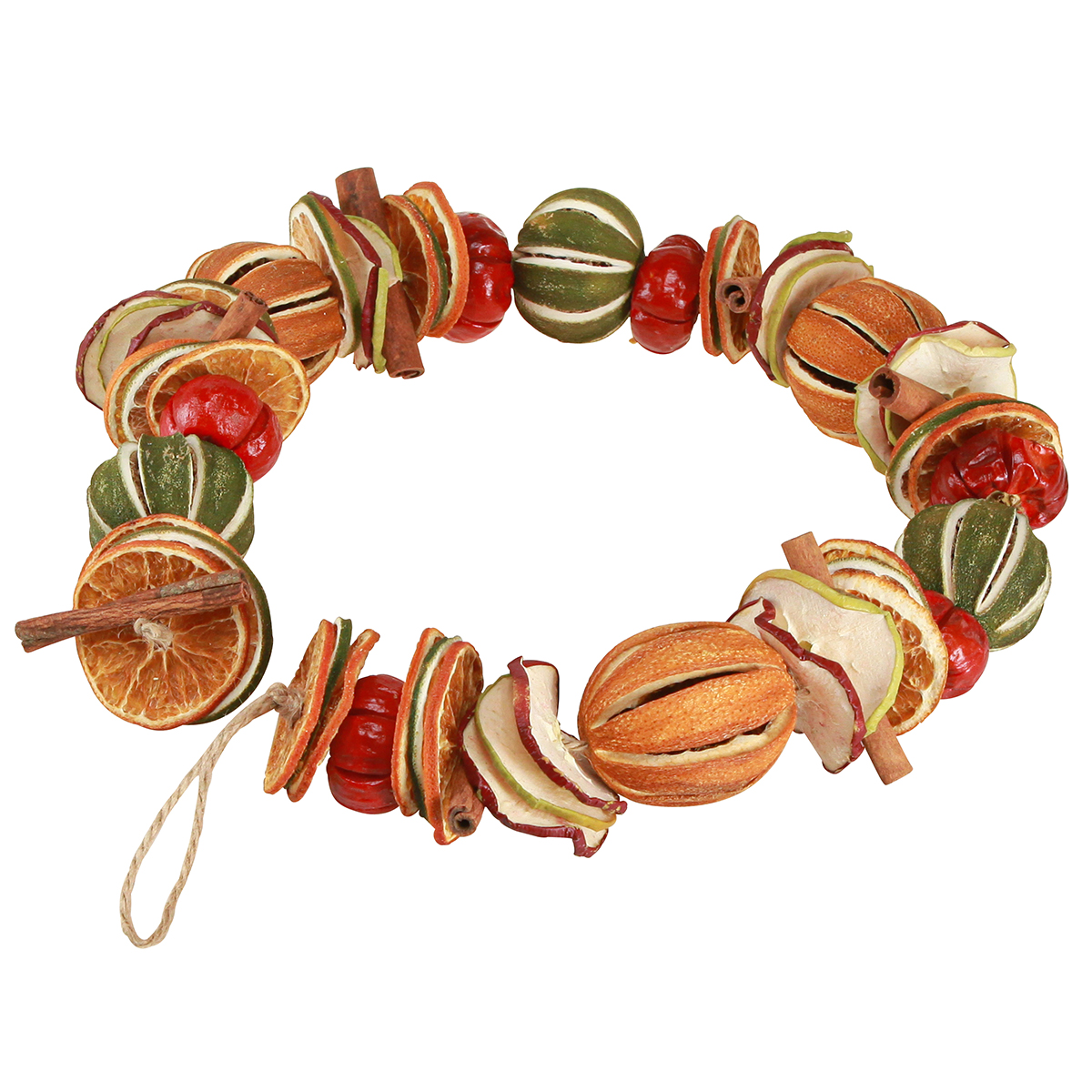 - Guirlande décorative rustique fabriquée à partir de matériaux naturels séchés ; Limes, oranges, pommes, cannelle et poivrons ronds