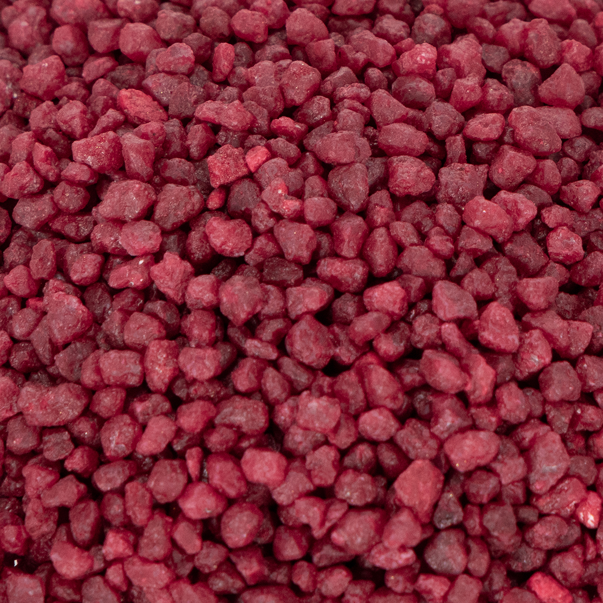 Geliefert wird das Dekogranulat im Farbton Burgund (Königsrot) in einem Beutel mit einem Gewicht von circa 2 Kilogramm. Die kleinen Kieselsteine sind dabei in etwa zwischen 2 und 3 Millimeter groß.