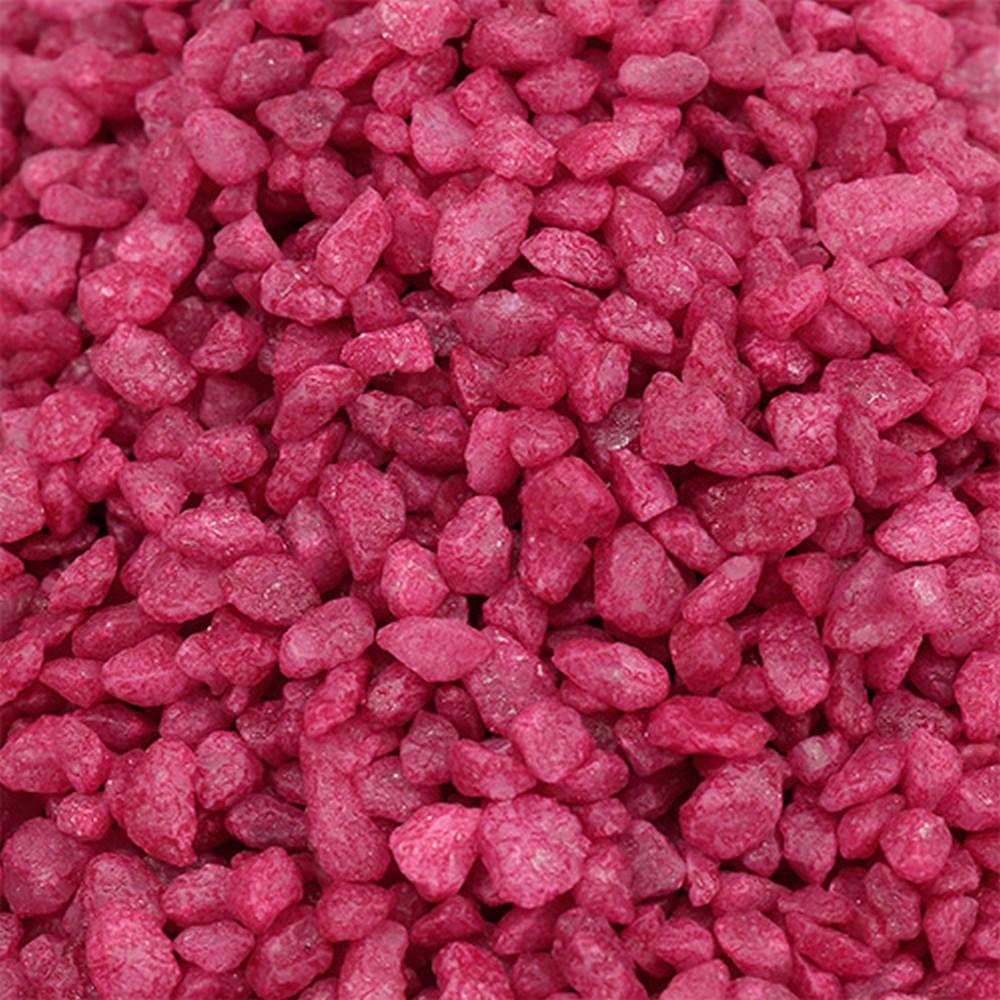Les granulés décoratifs colorés en fuchsia sont proposés dans un sachet pesant environ 2 kilogrammes. Les pierres mesurent entre 2 et 3 millimètres et conservent leur couleur vive même sous l'eau.