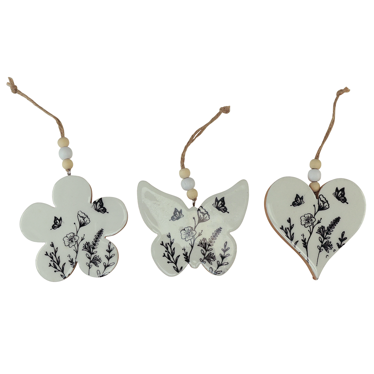 Gli incantevoli appendiabiti decorativi in legno con un delicato motivo floreale portano la primavera e l'estate nella tua casa! I graziosi accessori per la casa hanno la forma di un cuore, una farfalla e un fiore.I pendenti in legno con cordoncino di iuta e perline di legno hanno sulla parte anteriore una superficie bianca lucida che ricorda la porcellana. I delicati fiori e farfalle dei pendenti decorativi sono disegnati amorevolmente in nero con grande attenzione ai dettagli.