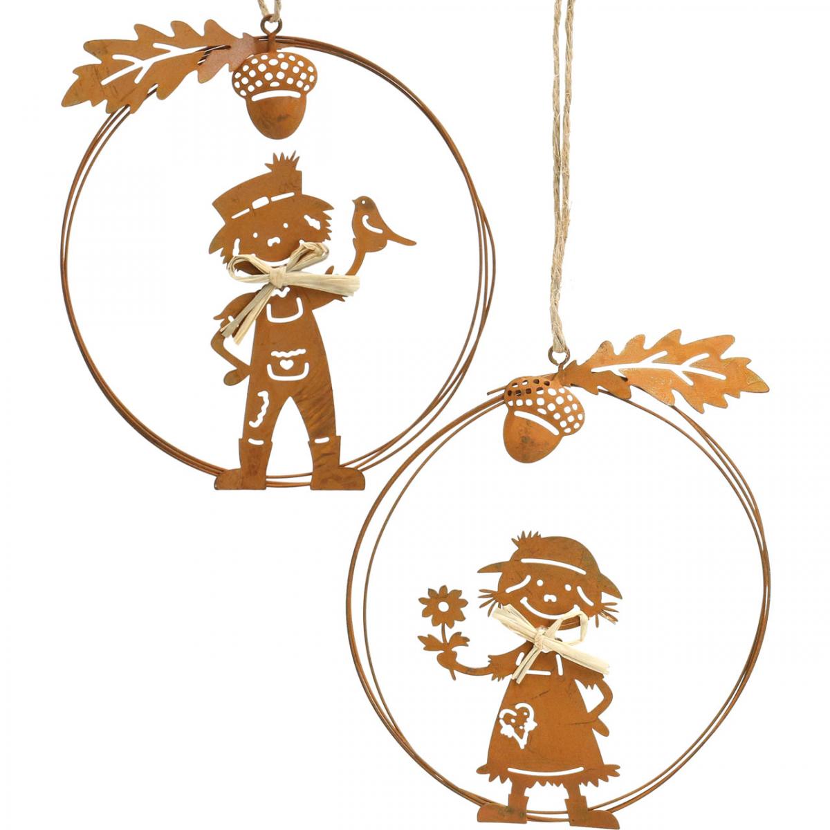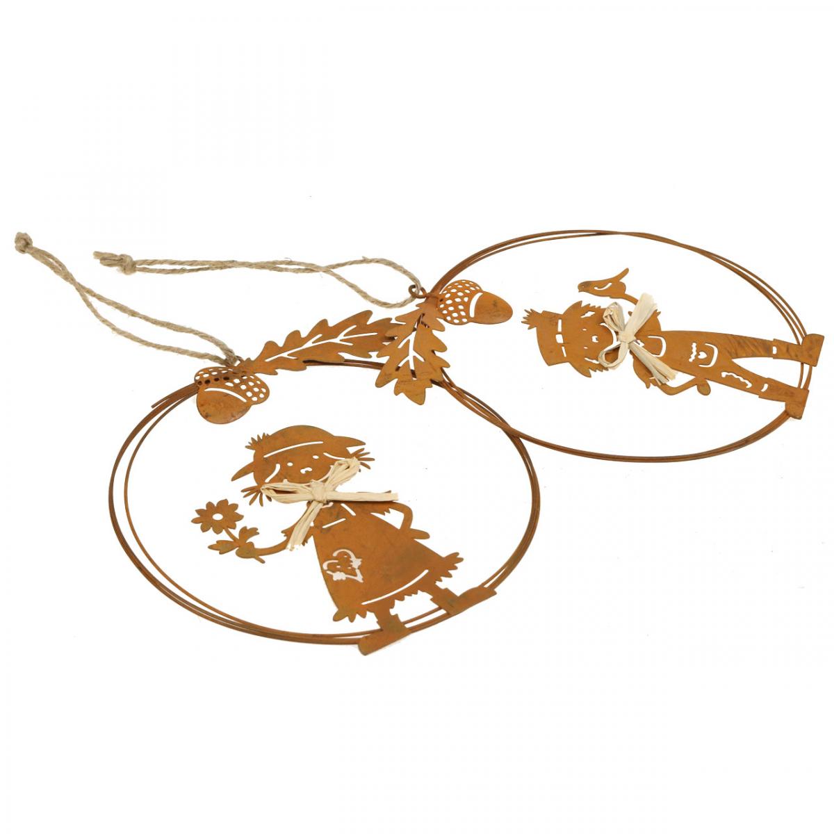 Questi attaccapanni decorativi dall'aspetto ruggine ti metteranno di buon umore per l'autunno! I bambini sono vestiti con i costumi tradizionali e ridono ampiamente. Un uccellino si siede sulla mano del ragazzo. La ragazza, invece, tiene in mano un fiore.Entrambe le figure sostengono con disinvoltura i polsi liberi, il che conferisce al soggetto una spensieratezza. Le figure decorative per l'autunno portano al collo un fiocco di rafia. Un cordoncino di colore naturale funge da appendiabiti, che conferisce alla decorazione autunnale un carattere ancora più vintage.