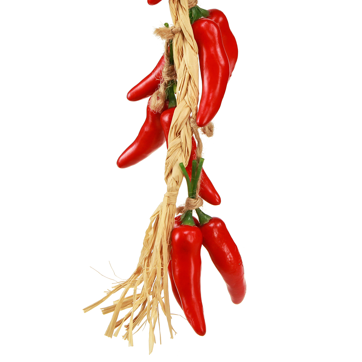 Unsere künstlichen Deko-Chilis in strahlendem Rot bringen als Sommer-Dekohänger ländliches Flair in Ihre vier Wände. Gefertigt aus hochwertigem Kunstmaterial, bestechen die Chilis mit realistischem Aussehen und sind an einem Strang aus Kunstbast angebracht, der am Ende eine praktische Schlaufe zur einfachen Anbringung bietet.