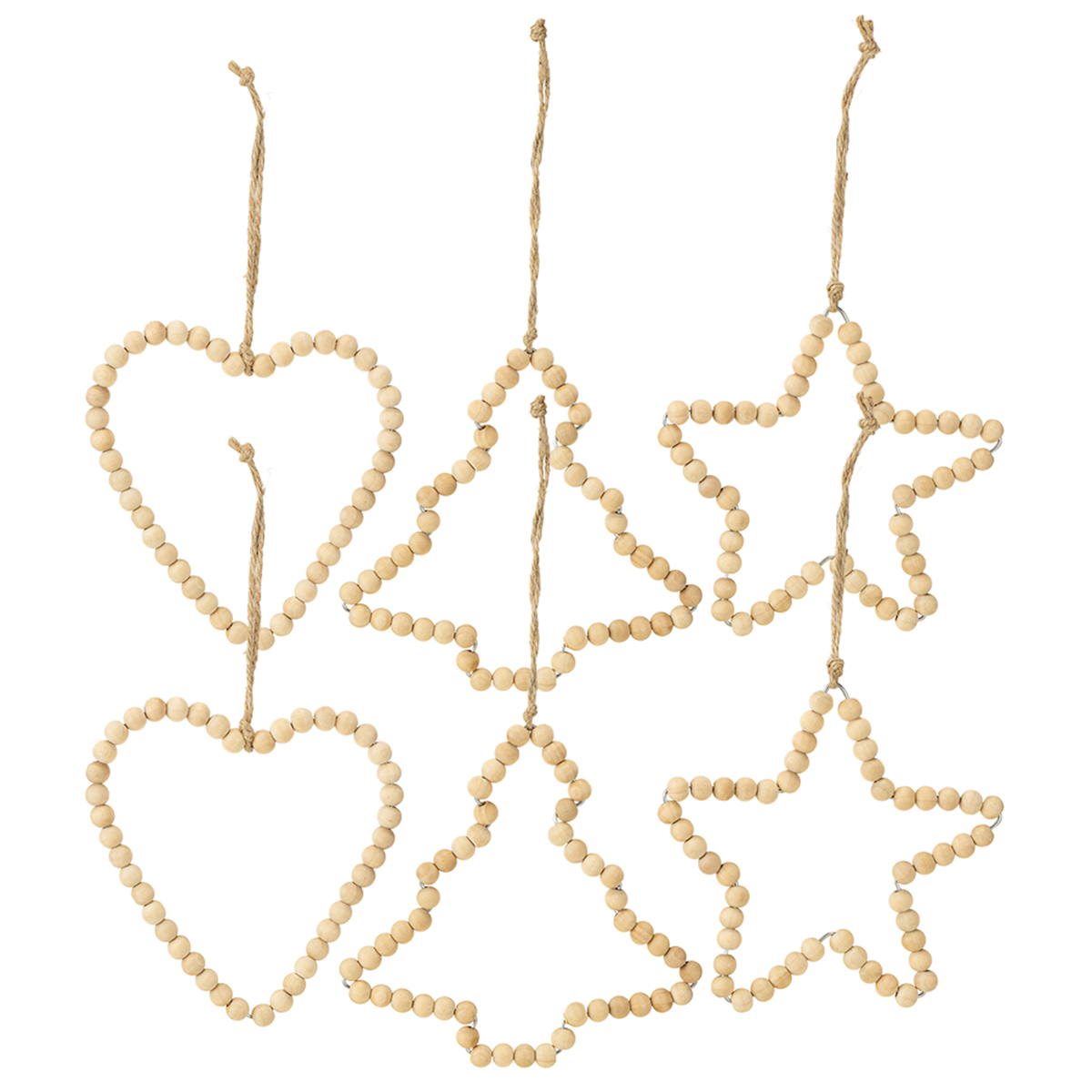 Décorations de Noël : perles en bois, cœur, étoile, sapin, 13 cm de haut, lot de 6