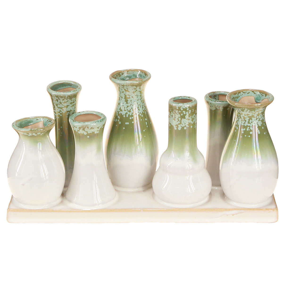 - Set aus 7 dekorativen Keramikvasen auf einem stabilen Tablett