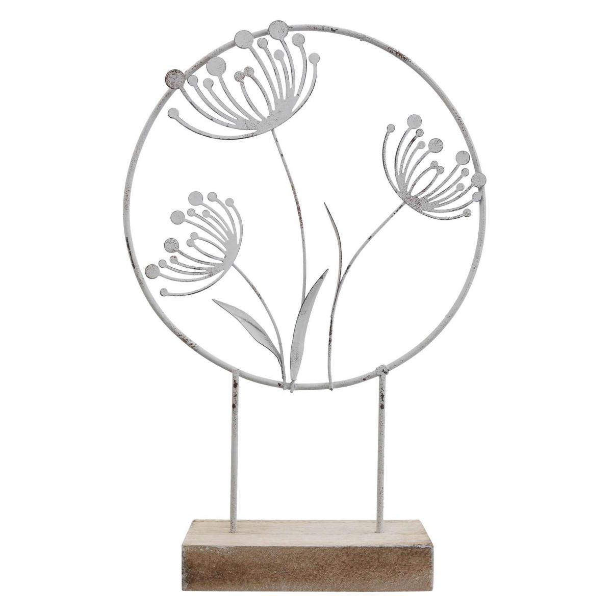Das Blumen-Motiv auf dem Dekoring wirkt nostalgisch. Vielleicht ist dieser Eindruck des Aufstellers den geschickt gesetzten, kleinen Akzenten in Rostfarbe geschuldet, die den Shabby-Look erzeugen. Denn an sich ist die stilisierte Schafgarbe dieser Metall-Deko in modernen Formen gestaltet. Der Sockel aus Holz wurde passend zum Deko-Ring weiß gewaschen.