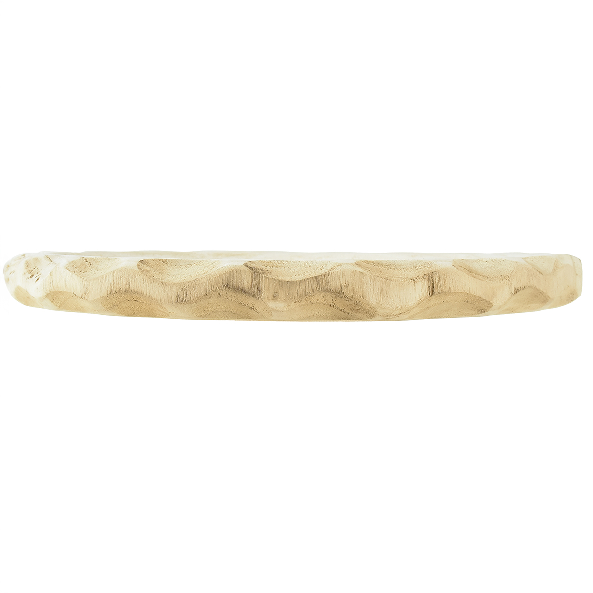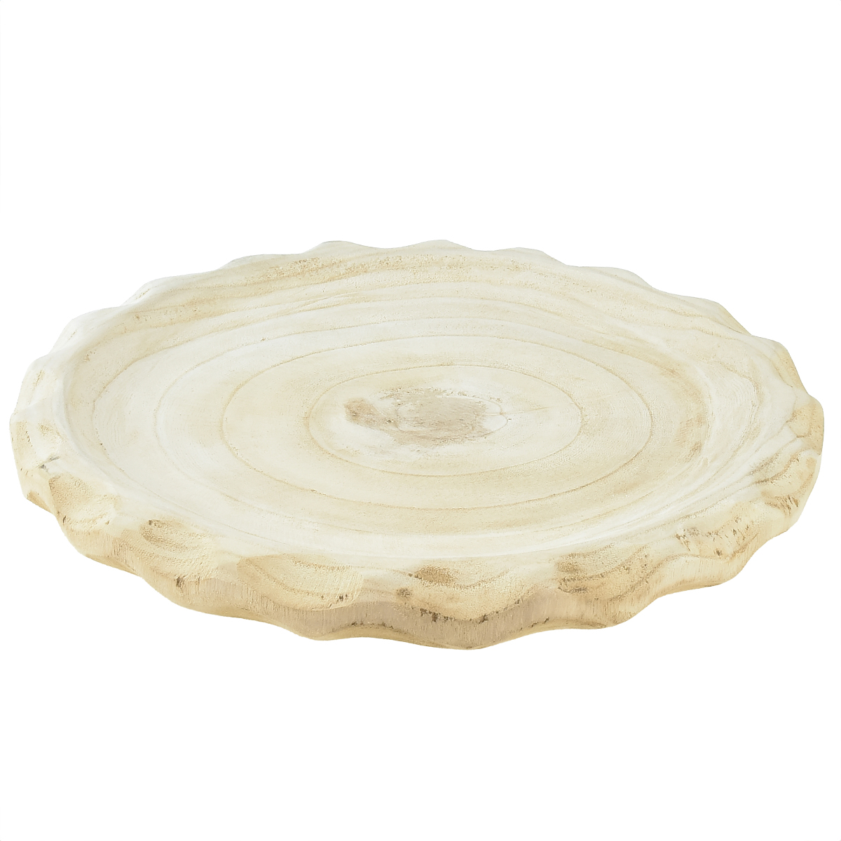 Le bol décoratif se compose d'un grand disque d'arbre avec les cernes annuels. Seul le bord est légèrement relevé et agrémenté de larges et régulières entailles. Le bol rond n’étant pas peint, il ne doit pas entrer en contact avec l’humidité ou la cire de vos décorations.