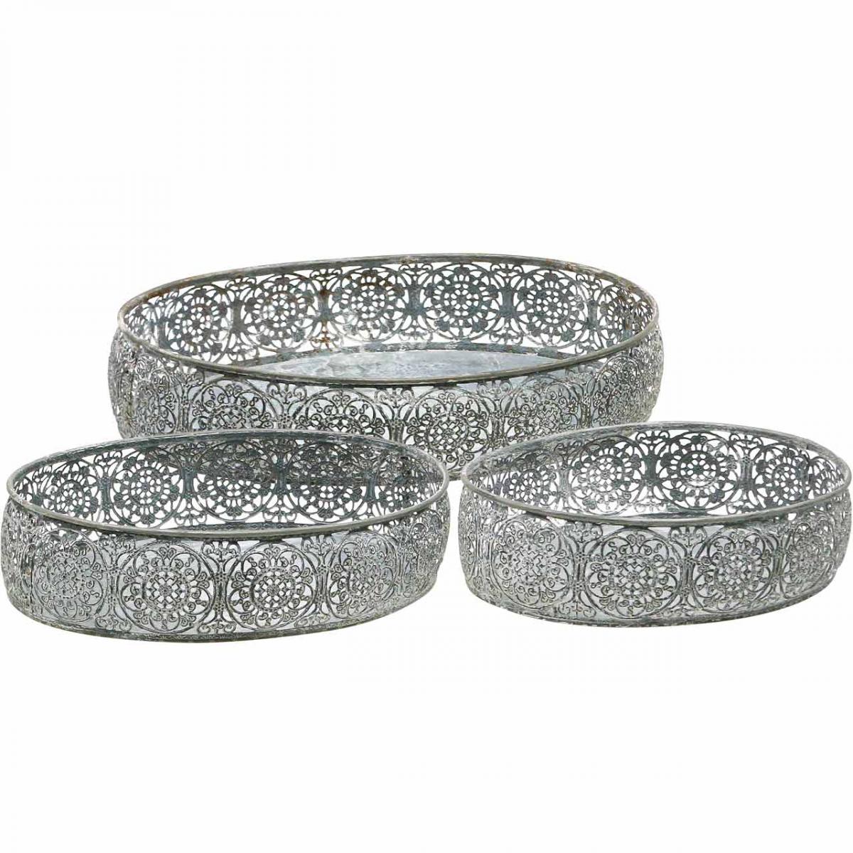 In questo set ottieni tre ciotole decorative in metallo dal design incantevole. Le ciotole ovali sono particolarmente accattivanti grazie alla loro decorazione floreale in filigrana. Il bordo decorativo dettagliato mostra motivi di fiori e viticci. Lavate in grigio argento e bianco, le tre ciotole di metallo adornano qualsiasi interno in stile vintage.Le ciotole decorative sono realizzate in tre diverse dimensioni. Questo apre una vasta gamma di possibilità per decorarli. Puoi utilizzare la piccola ciotola, ad esempio, come un attraente ripostiglio per i tuoi oggetti di valore. Le ciotole più grandi possono essere incluse in un'ampia varietà di disposizioni.