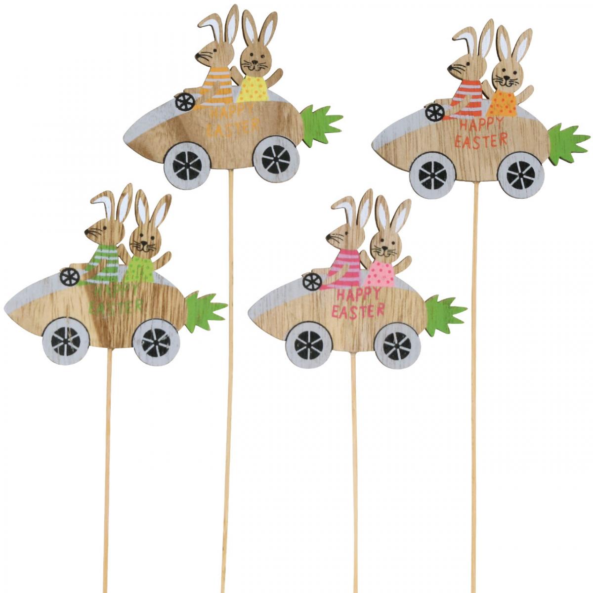 Sie bekommen insgesamt 16 vierfarbig sortierte Dekostecker mit den Hasen im Auto, das heißt vier Osterhasen am Stab von jeder Farbvariante.