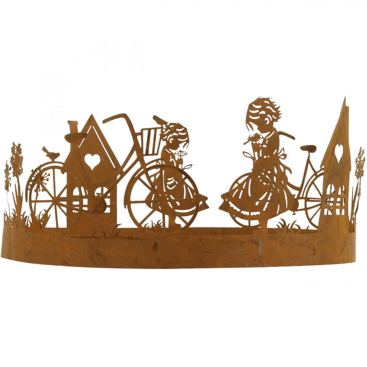 Produktname: Dekotablett Mädchen mit Blume, Metalldeko mit Fahrrad Haus Pusteblume Edelrost Ø24cm H11cm
