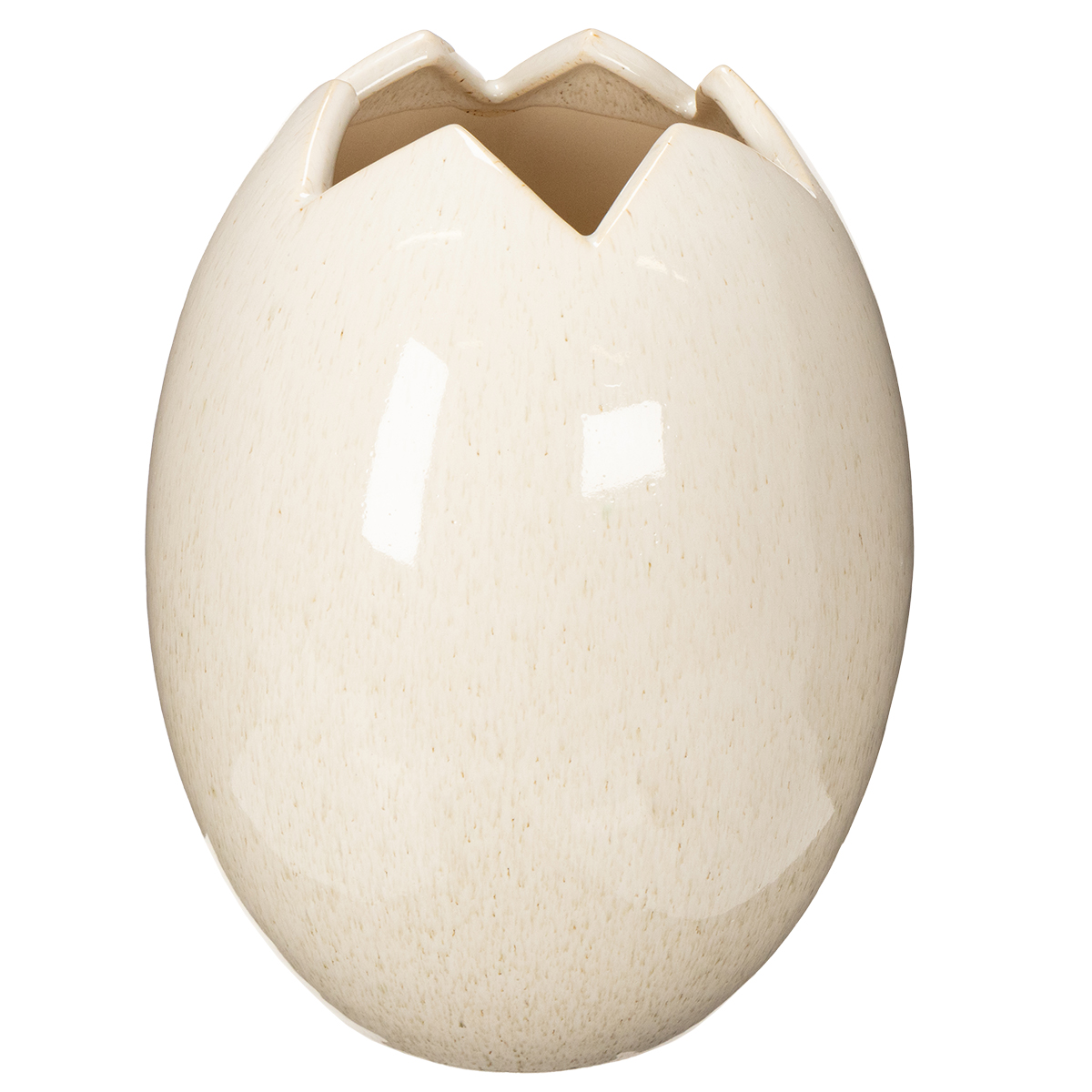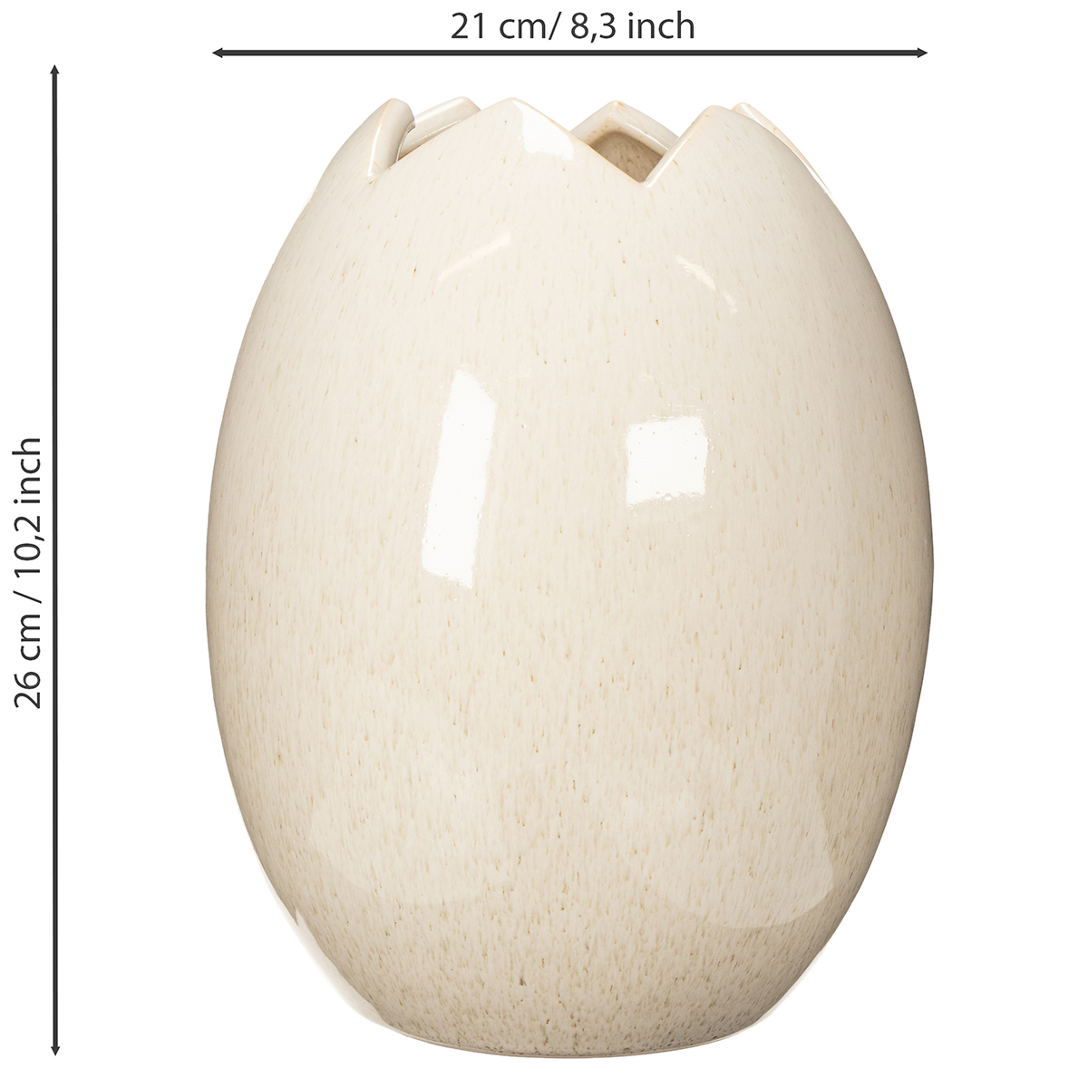 Die Dekovase in Ei Form vereint modernes Design mit vielseitiger Funktionalität. Mit ihren Maßen (Höhe 26 cm, Durchmesser 21 cm) und dem hochwertigen Material Keramik fügt sie sich nahtlos in unterschiedliche Wohnbereiche ein. Ihr schickes gesprenkeltes Weiß sorgt für eine zurückhaltende Eleganz, die nie aufdringlich wirkt. Besonders die gebrochene „Eierschalen“-Optik an der oberen Kante macht sie zu einem echten Hingucker.