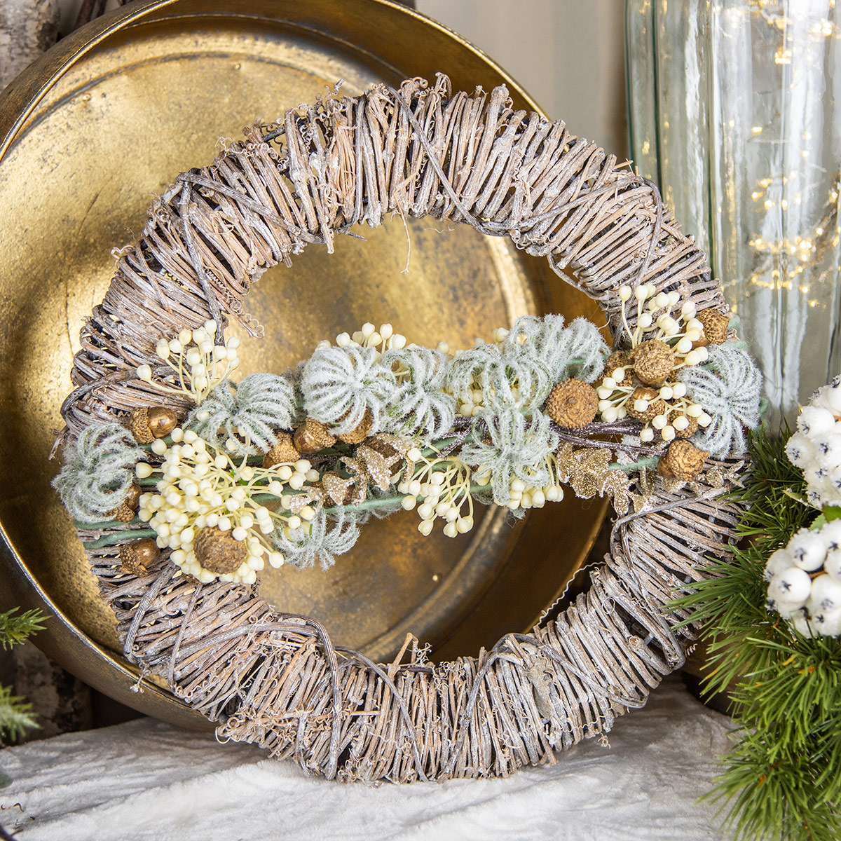 Frostig und stilvoll geht es zu bei dieser DIY-Idee: Der Eukalyptus, der aus einem modernen Weihnachtskranz kaum noch wegzudenken ist. Die Hortensien mit ihren wunderschönen Dolden wirken als Kunstblumen wie echt. Außerdem kommen auf den Türkranz künstliche Clematis und echte Eicheln. Der Türkranz für den Advent selbst ist ein Rebenkranz mit einem Durchmesser von 38 Zentimetern.