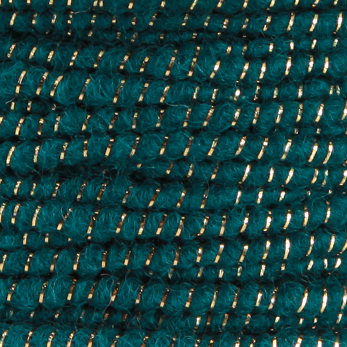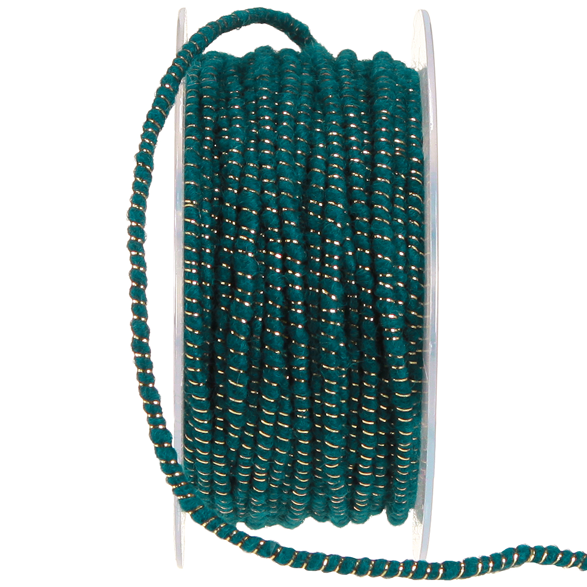 Die türkisfarbene Wollschnur mit goldenem Lurexfaden befindet sich auf einer praktischen Kunststoffspule und ist etwa 33Meter lang.