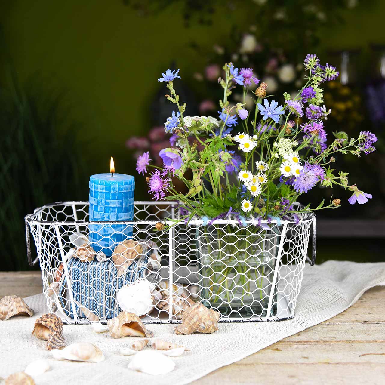 Ob als Balkondeko, als Accessoire für den Garten oder als Tischdekoration für festliche Anlässe Die eckigen Drahtkörbe können mit bunten Blumen, Kräutern oder auch Gestecken bestückt werden. Oder Sie nutzen die hübsche Metalldeko zur Aufbewahrung von Kleinigkeiten in Haus und Garten.