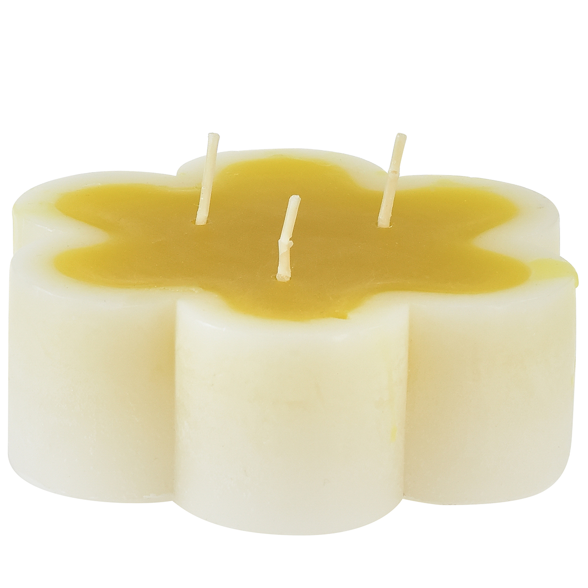 Produktname: Dreidochtkerze Deko Blüte Kerze Gelb Weiß Ø11,5cm H4cm