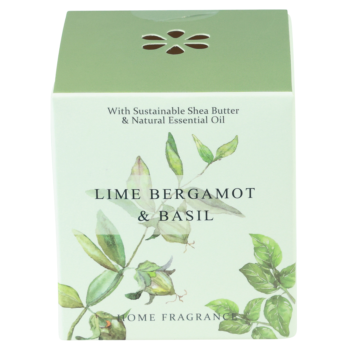 L'arôme frais et floral du citron vert et de la bergamote rencontre le parfum épicé du basilic dans cette bougie parfumée dans un verre. Cela crée un parfum frais et exotique qui s'intègre à merveille dans votre salle de bain ou sur le balcon.L’emballage à lui seul est une belle idée cadeau – et durable en plus. Le motif décoratif de bergamote et de basilic orne la boîte en carton de couleur crème qui porte le label FSC.