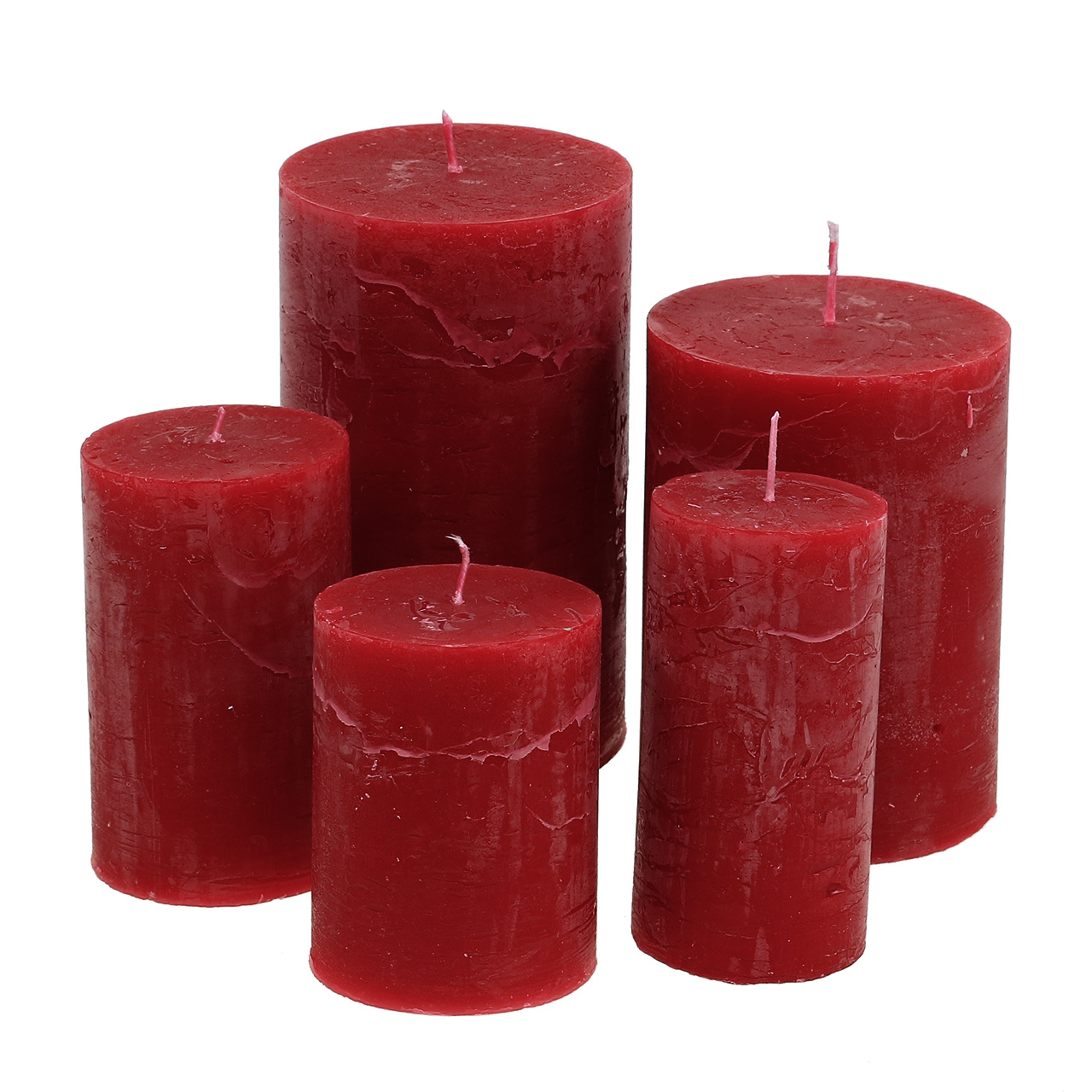 Le candele colorate di colore rosso scuro sono fornite in set in scatole di cartone di piccole dimensioni, sicure per il trasporto. Si noti che a seconda del set selezionato, la quantità, la dimensione e il tempo di combustione delle candele del pilastro varieranno.