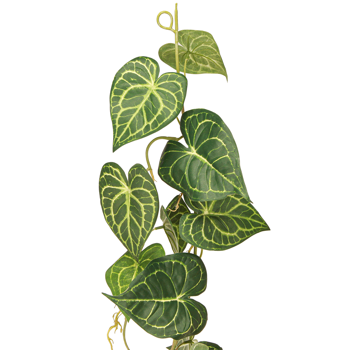 Unterschiedlich große und grüne, charakteristisch marmorierte und geäderte künstliche Blätter sind auf dieser Kunstpflanzen-Girlande angebracht. Dazu kommen realistische Luftwurzeln. Eine Öse ermöglicht das unkomplizierte Aufhängen und Dekorieren.